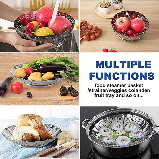 Multifunctional Steamer Basket – The foldable steamer can be used to steam vegetables, seafood, eggs, meat, desserts, etc. At the same time, the steamer can also be used as a water filter tray for washing fruits and vegetables, and it can also be used in parties to hold various snacks, fruits,