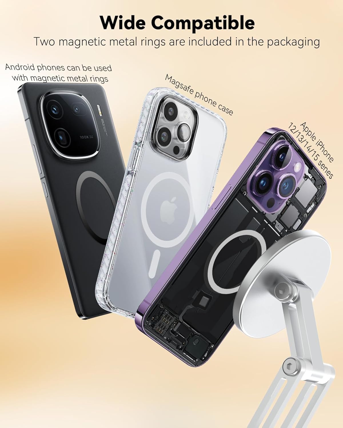 【Wide Compatibility】: The cell phone holder desk is compatible with iPhone 16, 15, 14 Pro Max, 13, and 12 series as well as Mag-Safe cases. We include additional metal rings for this phone holders. Stick the metal ring on Android phones or cases for your phone completely stable and securely, for living room, home, coffee shop, office desk, kitchen, take pictures, travel and many other scenes office desk accessories