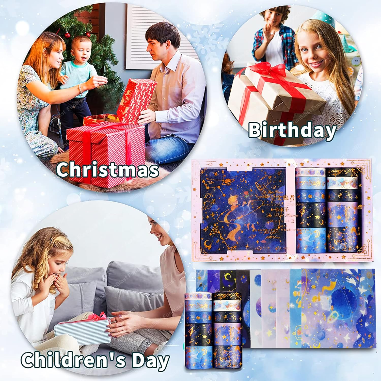 Washi Tape Set for Journal – FunBlast Space Theme Washi Tape Sets package comes with 10 rolls of masking tapes + 10 sheets of washi paper stickers.