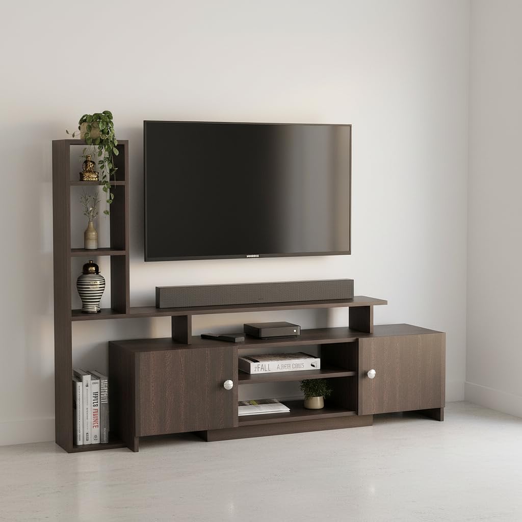 Enhance your living space with this modern TV unit from FURNEASER, thoughtfully designed for both style and everyday functionality. Made from durable engineered wood, this entertainment unit features a wide TV panel, open media shelves, closed cabinets, and a vertical side display rack for décor and books. The elegant wenge finish complements contemporary interiors while offering organized storage for media accessories and living room essentials.