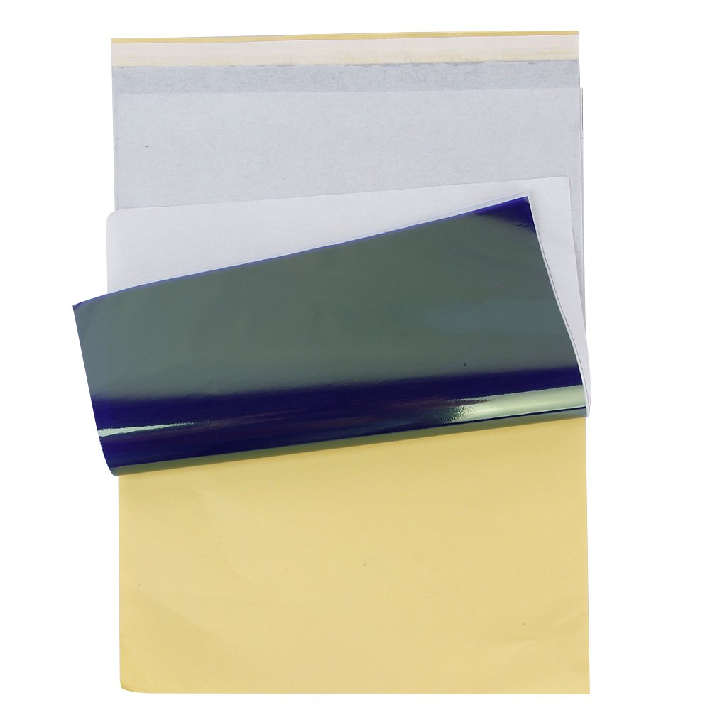 Description: used for transferring the tattoo design from the paper to the skin professional for both beginners and tattoo body artists fully loaded with extra carbon for the perfect stencil transfer, either by hand or thermal machine reusable and can help the beginners overcome many obstacles in learning tattoo adopting complex designs, each transfer paper contains 4 layers: blue layer: the transfer paper is made up of 2 sides: one smooth, the other full of toner powders top layer: white, this is the layer that your image will be transferred onto second layer: unbound and white, typically this layer is thrown away the bottom sheet: yellow, it holds in place when using a stencil copy machine easy use, put the image on the toner powders, and then draws the outline and attached to the skin on it specially coated to protect hands/clothing can be used with thermal copier machine or dot matrix printers size: approx. 11.6 x 8.3 inch/29.5 x 21cm package includes: 1 x 10 sheet tattoo transfer paper.