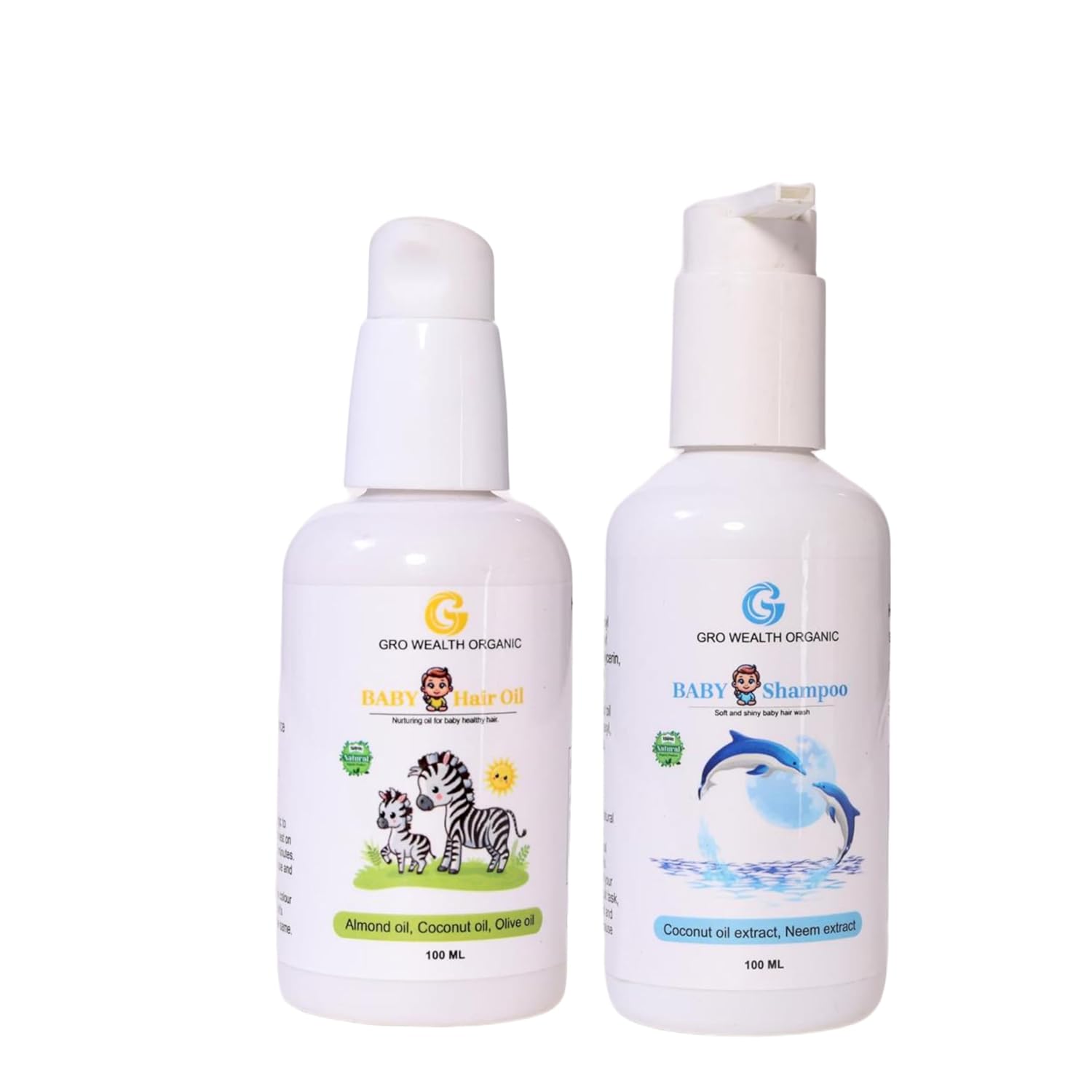 Give your baby’s scalp some ayurveda care! Soak in the goodness of the age-old ayurvedic concoction of miraculous herbs & oils of baby hair oil. Fortified with the extracts of herbs like nariyal, almond, olive and much more, which strengthens hair, promotes hair growth & stimulates the scalp. The ritual of champi (hair-oil massage) has been long imbibed in our culture, baby hair oil preserves that ritual by bringing you natures luxurious herbs and oils that enriches & soothes the scalp, helps alleviate dandruff & encourages healthy hair growth. Use it for gentle and soothing baby massages, as a natural moisturizer, for relieving cradle cap, or even as a pure and natural diaper rash ointment.Beyond its practical uses, baby massage is an excellent way to bond with your little one. Our oil nourishes your baby’s skin and hair but also provides a loving and bonding experience between you and your child. GRO WEALTH ORGANIC Designed with your baby’s delicate skin in mind,baby shampoo products are tear-free, hypoallergenic, and free from harmful chemicals. The avocado and olive extracts deeply nourish and moisturize, while chamomile and calendula help soothe and calm sensitive skin.Neem hydrates and leaves the hair soft and manageable, providing the best possible care in a shampoo for baby.