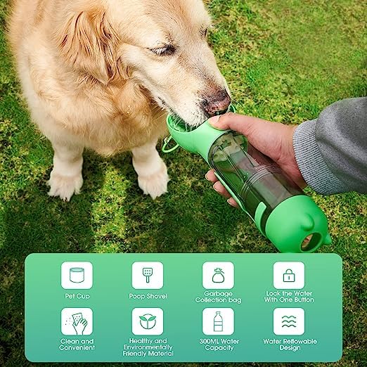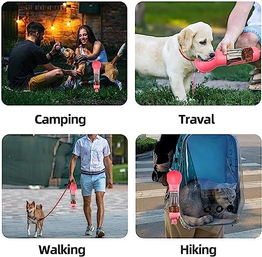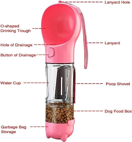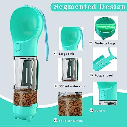 ✅Features: This pet dog water bottle integrate a dog water dispenser, a dog food container, a dog poop scooper, and a dog poop bag holder in one. It is great suitable for walking dog and traveling with pet.