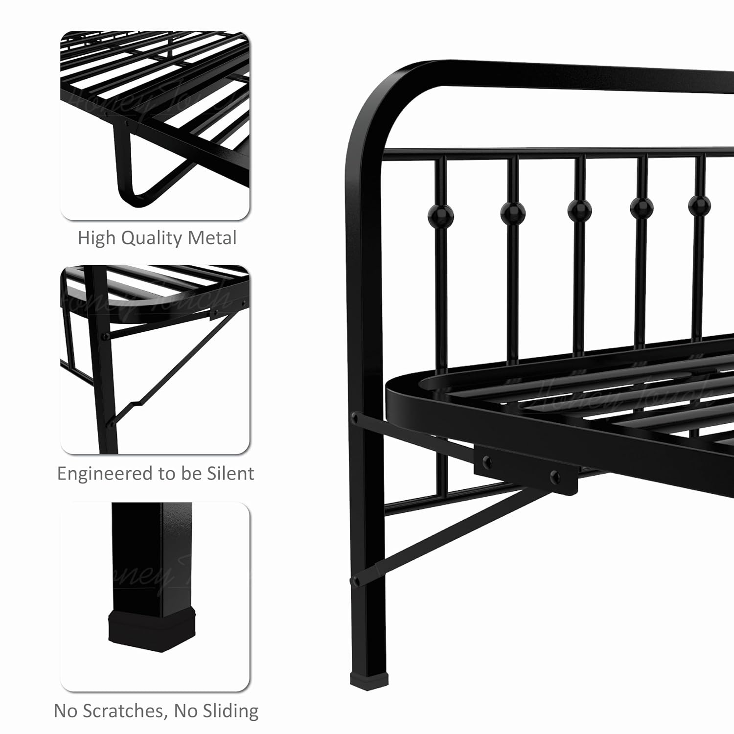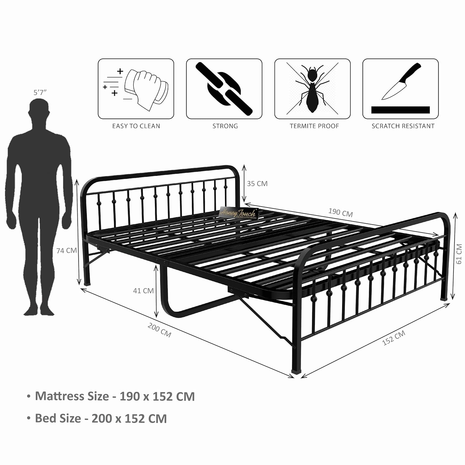 Sturdy Bed Frame: Premium quality steel, Manufactured with Cold rolled corrosion resistance steel assuring a long shelf life. Additionally, 2mm thick powder coating on top to avoid any corrosion which also adds a premium touch.