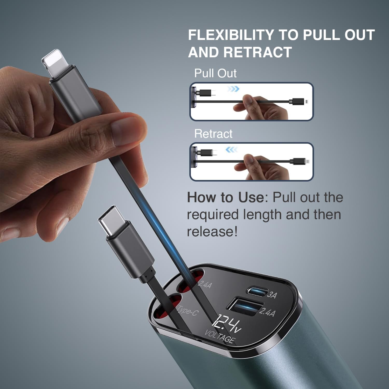 4-in-1 Retractable Design – Adjustable Length Retractable Cable Design. The fast car charger is equipped with 2 retractable cables (one iPhone cable and one type-C cable), a maximum stretching length is 24 inches. Stretch to the required length and then release to start charging. After charging, continue stretching for a short distance and then release to automatically bounce back to its original position, keeping the car clean and tidy, effectively avoiding cable entanglement and confusion.