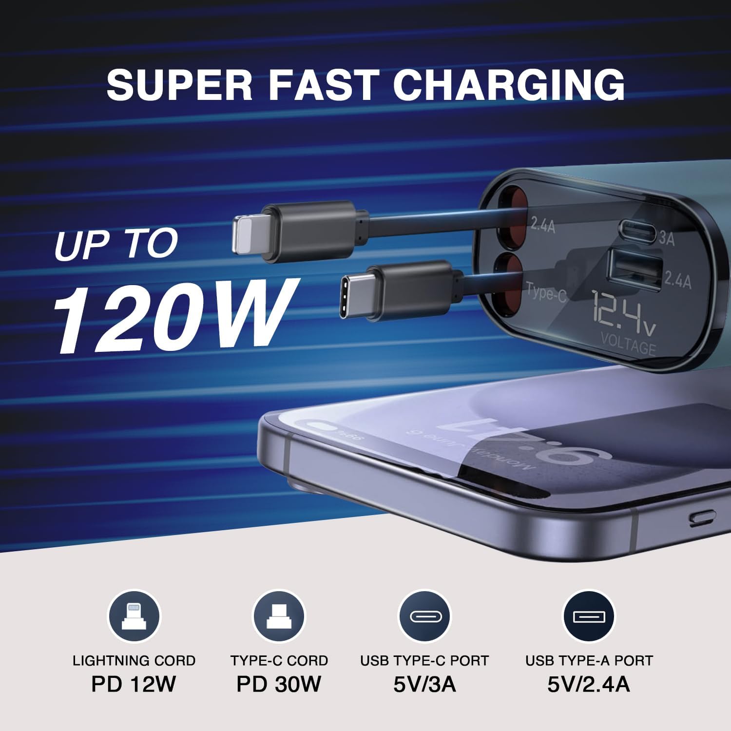 120W Super Fast Charging – Powerful total of 120W output ensures iPhone -fast charging for smartphones, tablets & more, keeping all devices powered up on the go. Proper distribution of power between multiple devices being plugged together.