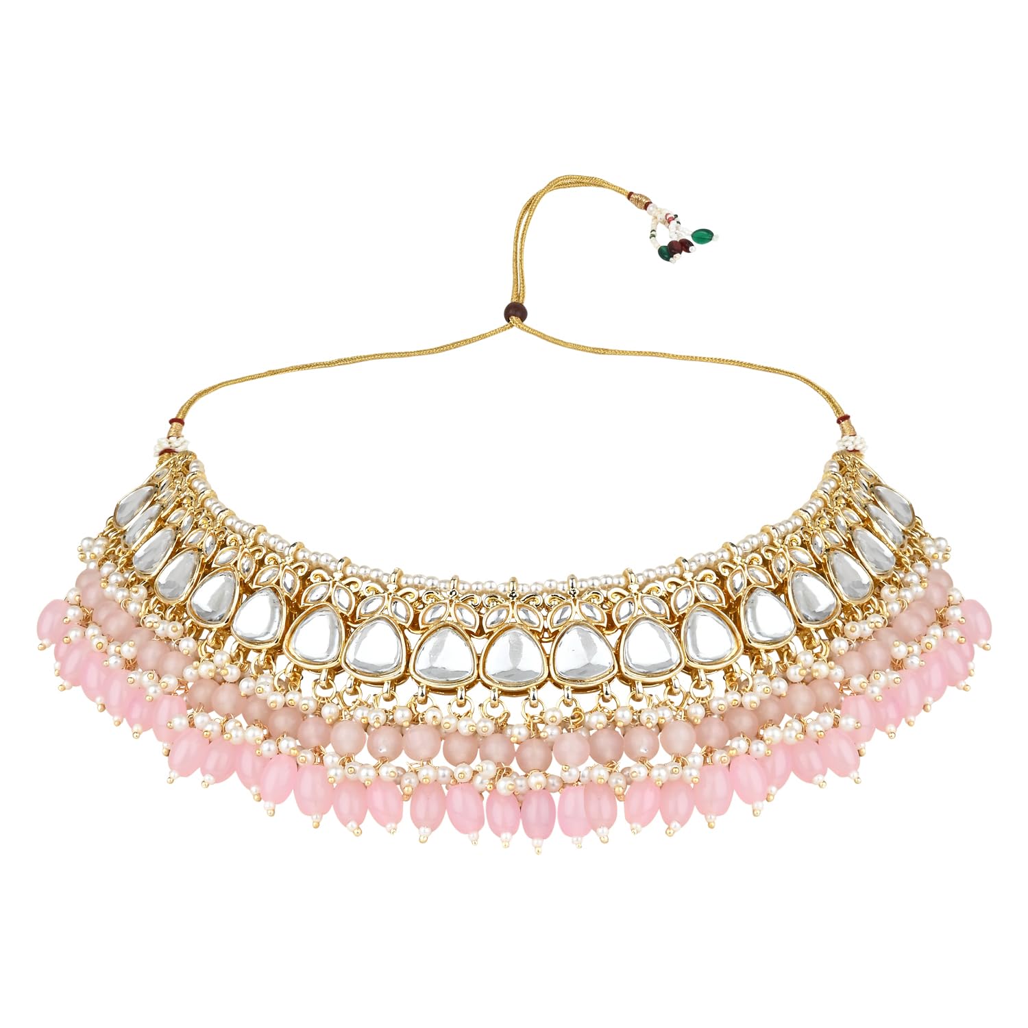 The gold-plated choker necklace set consists of a necklace, a pair of earrings, and a maang tikka. The necklace features kundan studded with pearl beaded in it, giving it an elegant and traditional look. The stones and pearls are set in a beautiful pattern, adding a touch of sophistication and grace to the necklace. The necklace is secured with drawstring closures, which make it easy to adjust the size to fit comfortably around the neck. This is an important feature, as it ensures that the necklace will be comfortable to wear for extended periods of time. The necklace is secured with drawstring closures, which make it easy to adjust the size to fit comfortably around the neck. This is an important feature, as it ensures that the necklace will be comfortable to wear for extended periods of time. The earrings and maang tikka are also adorned with stones and pearls, which match the pattern of the necklace. The earrings have a beautiful design, which makes them easy and comfortable to wear. The maang tikka is a traditional Indian hair accessory that can be worn with the necklace and earrings to complete the look.