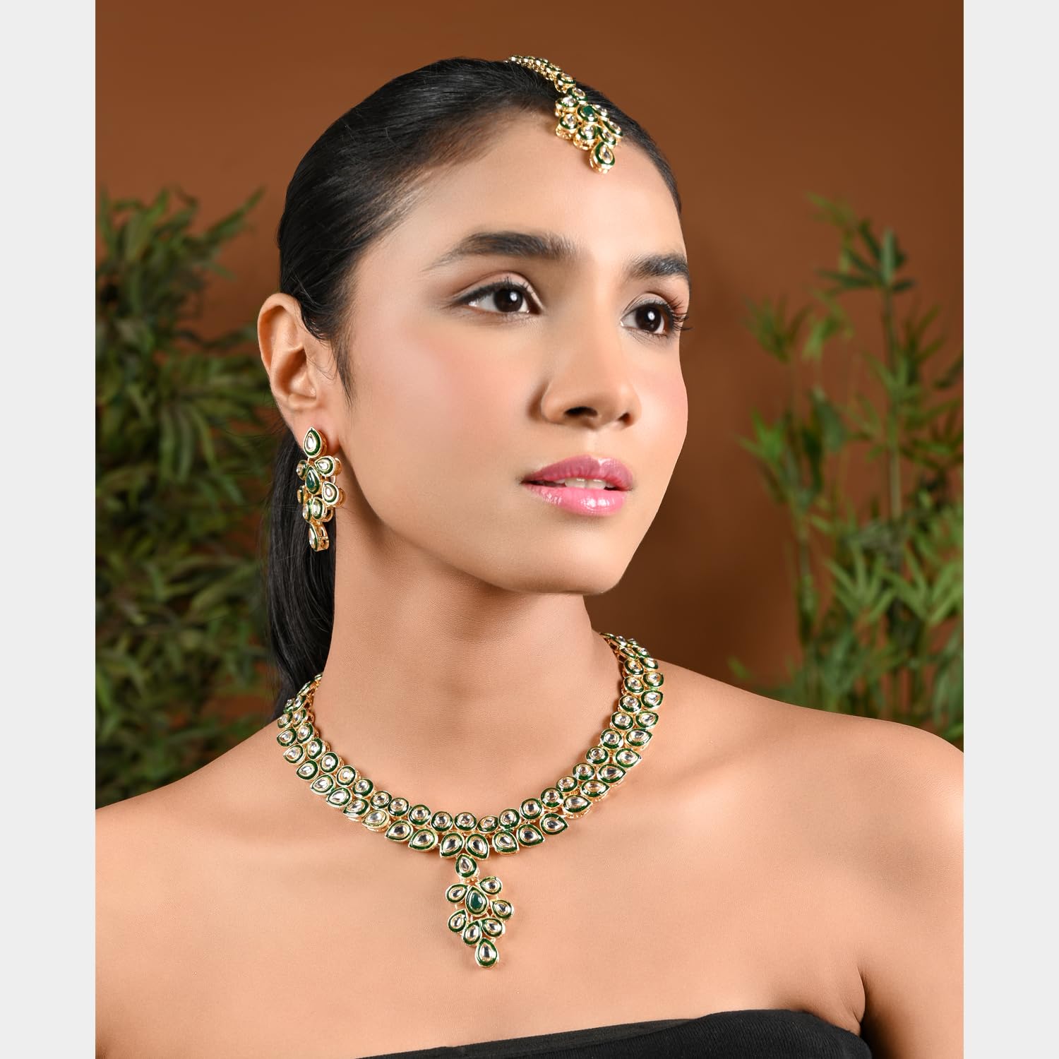 This jewellery set is crafted in gold plating and consists of a necklace, maang tikka and a pair of earrings. The necklace features kundan & stone-studded in it and is secured with a drawstring closures. Style this necklace set with a saree or a salwar suit to enhance the look.