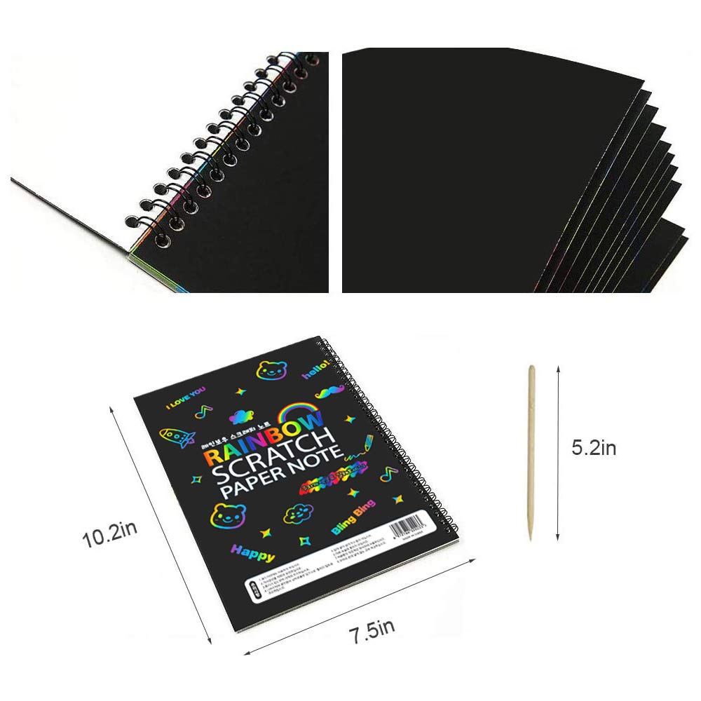 ✍️Brightly Colored 2 Scratch Art Notebooks Combo:Include 20 spiral-bound pages and 2 wooden pens. (10 pages x 2 pack , size: 10.2 x 7.5 inch), Our Scratch Art notes feature bright colors that hide beneath the matte coating; Kids simply use the included wooden stylus to reveal them with a simple scratch.