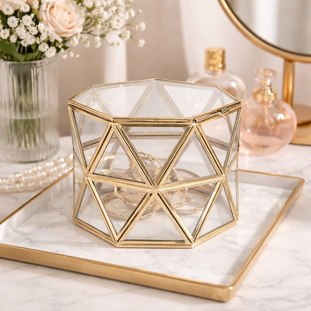 Add a touch of elegance to your home décor with this geometric glass decorative box, beautifully accented with golden metal edges. Perfect for displaying keepsakes, jewelry, crystals, or decorative shells, this stylish storage piece blends modern design with natural charm. Whether used as a centerpiece or a chic vanity accessory, it elevates any space with its sophisticated aesthetic.