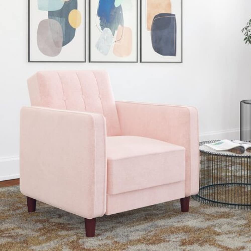 This chair has a vintage design with wide-track arms and vertical stitching with button-tufted details on the backrest. This chair also features a lush velvet fabric, creating the perfect accent piece for any decor.
