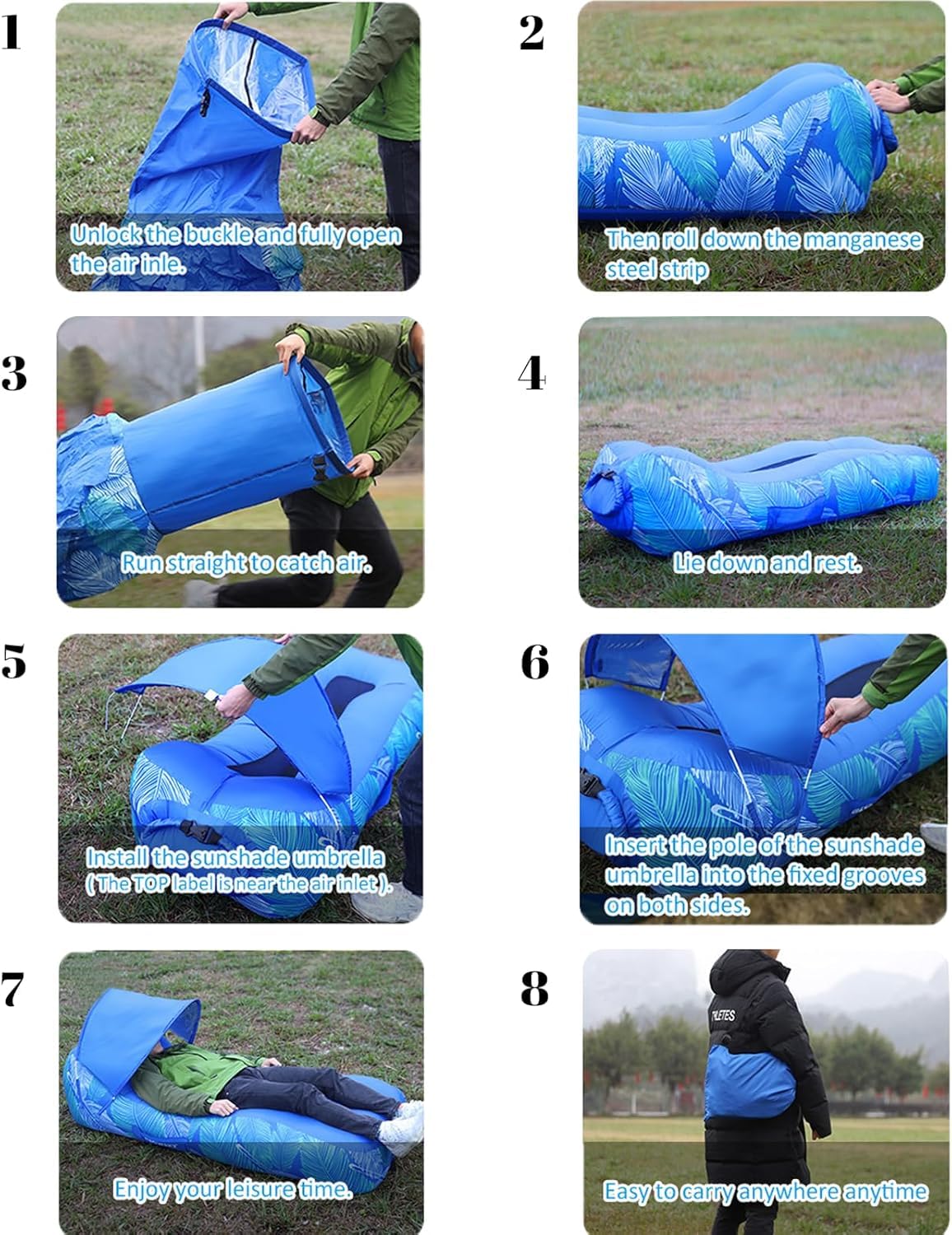 【Simple To Inflate】 Inflatable lounger takes an average of 2 minutes to inflate. No pump is required. Simply stir it in the air to inflate. Inflate once and it will last for several hours.