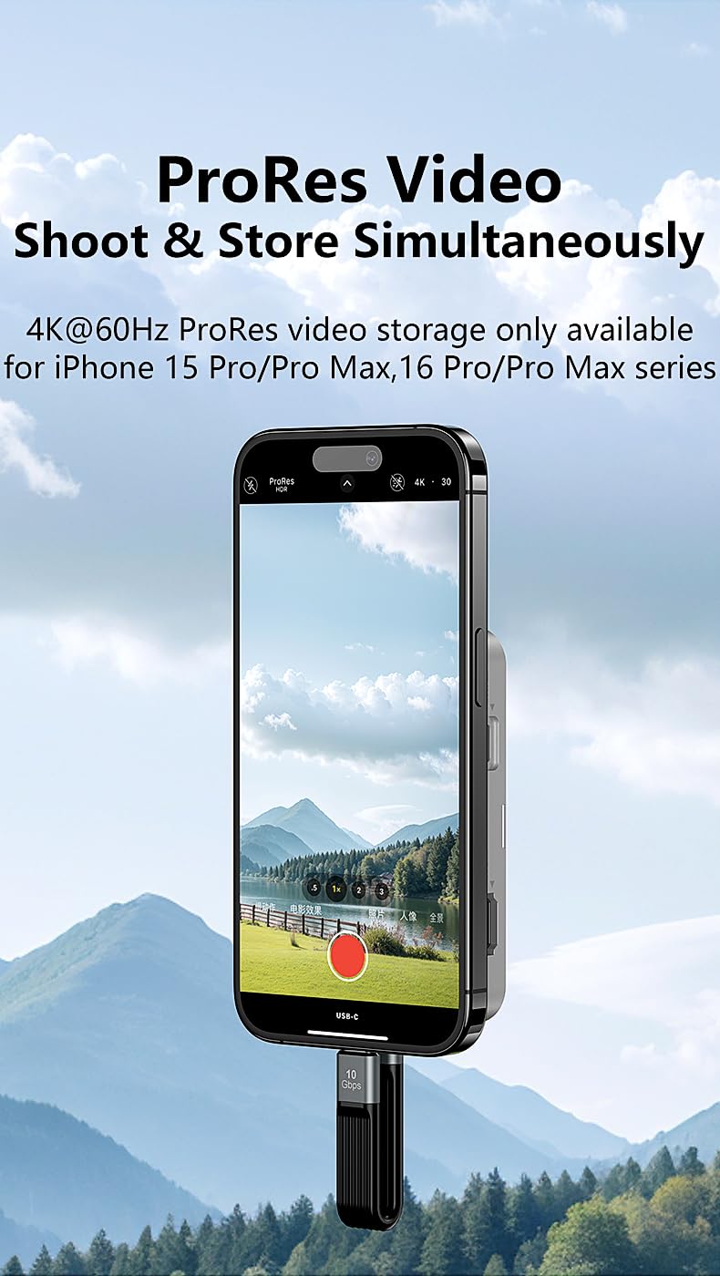 Direct Storage of ProRes Video: Compatible with iPhone 17 16 15 Pro/Pro Max,Can be connected to an SSD for direct external storage of the 4K ProRes videos you shoot.No more waiting for a separate transfer after recording and worrying about running out of phone memory.