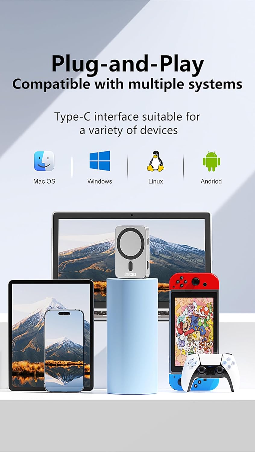 INICIO 10Gbps Magnetic M.2 NVMe MagSafe SSD Enclosure & USB C 100W PD HDMI Hub for iPhone 17 16 15 Pro Max ProRes MacBook iPad Pro S26 S25 Android, Support Size 2230/2242/2260/2280 (SSD NOT Included)