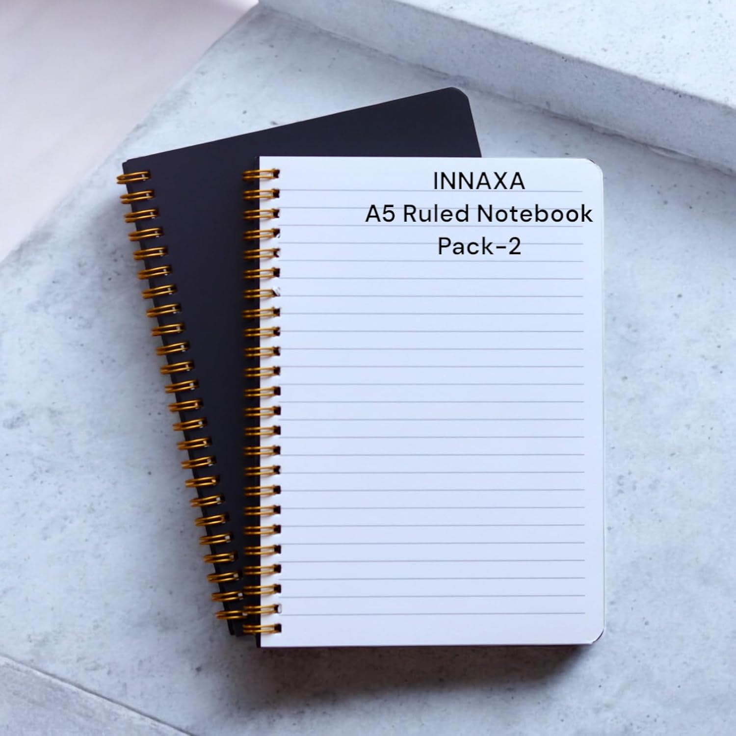 The INNAXA A5 Spiral Notebook (Pack of 2) is designed for professionals, students, and creatives who value structure and style. Each notebook features a premium matte black cover and golden spiral binding, offering both durability and elegance. The square grid layout on 100 GSM high-quality paper makes it ideal for bullet journaling, graphs, charts, math problems, or organized note-taking. With 60 sheets (120 pages) per notebook, this pack delivers excellent value and performance, all in a compact A5 size that fits perfectly in your bag or desk drawer.