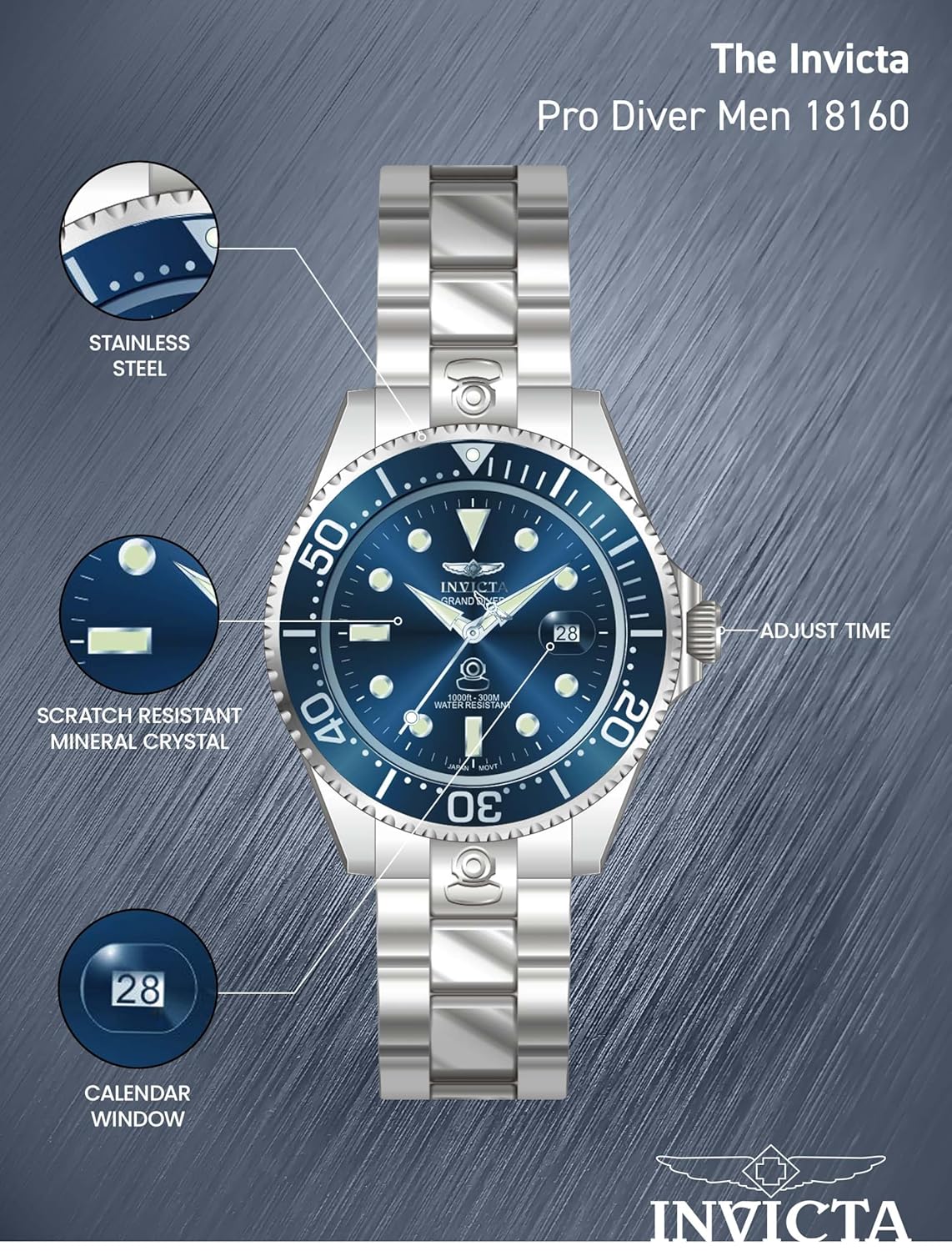 This men’s Invicta Grand Diver timepiece from the Pro Diver collection is a remarkable fusion between fashion and function. It has an incredible water resistance of 300 meters and sports a unidirectional bezel, a stainless steel band, and luminous hands. With a smooth blue dial accompanied by smooth automatic movement for a classic look while showing off its versatility, this timepiece is clearly a must-have.