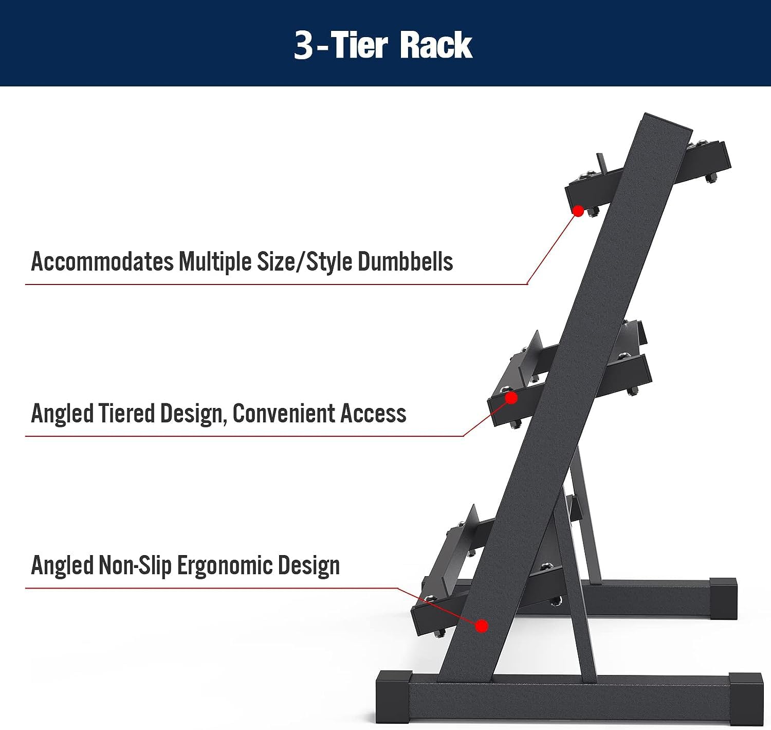 【Space-Saving Design】: The stand holder features a 3-tier storage space, angled and ergonomically construction design, compact. Allow you to place it in any part of your gym for easy equipment accessibility.