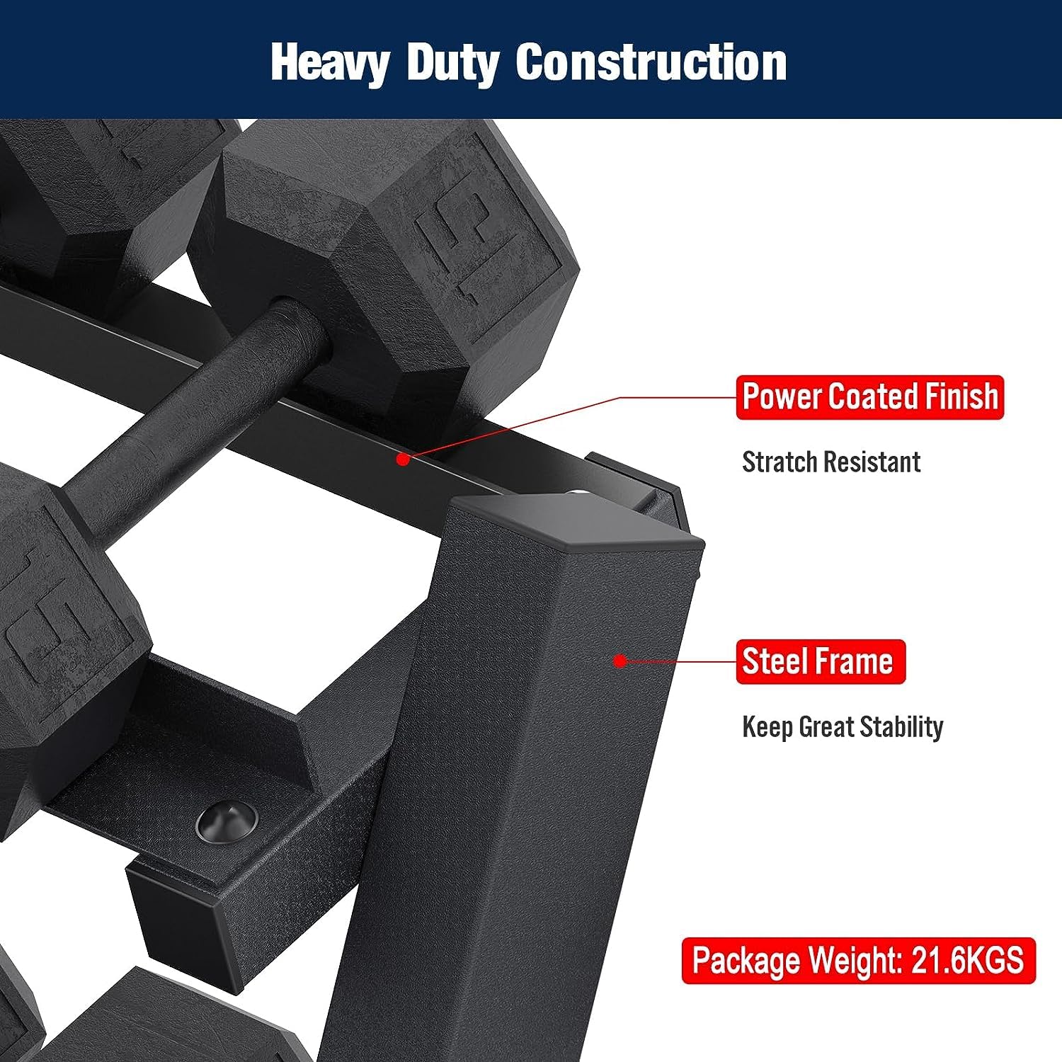 【Double Security for Stability】: The free weight organizer features rubberized feet and triangular structure, that not only provide dual stability also protect your floor from scratches. Moreover it absorbs shock during re-stocking, preventing the rack from sliding.