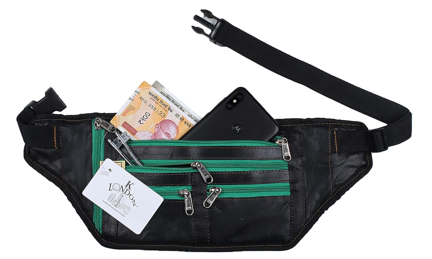 Stylish & trendy Black and green coloured Waist bag from the house of K London, designed to carry all small and regular accessory like cards, keys, earphones, power bank, coins, pen, Money,Passport,Card holders and other valuables etc. Made with high quality soft Genuine Leather. It has Adjustable Strap to fit waist of all sizes. It has 5 zipper pockets at front. This Waist pouch is ideal for men and women for travelling. Avoid contact with moisture and water.