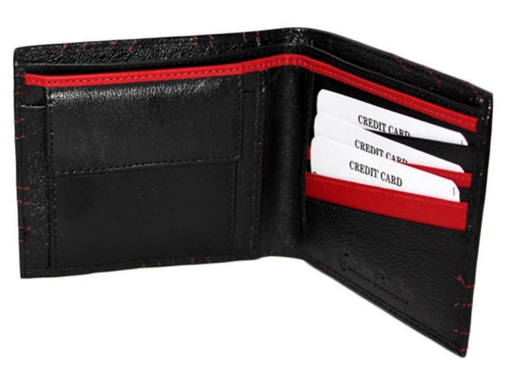 A Bi-Fold Black coloured wallet made in Real Leather. It comes with 4 card slots,2 note compartments and a coin pocket for utility.Its a classy wallet and is easy to maintain. It comes with a Union Jack design in red coloured thread and also has a great combination of black and red leather. Avoid contact with moisture and water.Comes packed in an attractive gift box. Crafted to meet the needs of the modern man, this wallet seamlessly blends functionality with a touch of boldness. The black and red color combination adds a dynamic and eye-catching element to the classic wallet design. Whether you’re heading to the office or a night out, this wallet complements your style with an air of sophistication. Inside, you’ll find carefully designed compartments for your cards and cash, providing organization and convenience. The wallet’s compact size ensures it easily slips into your pocket, keeping your essentials close at hand without adding bulk. The durable construction and high-quality materials ensure that this wallet is not only fashionable but also built to withstand the rigors of daily use. Its versatile design makes it an ideal accessory for various occasions, from formal gatherings to casual outings. Upgrade your essentials with our Men’s Wallet in Black and Red. Experience the perfect combination of practicality, style, and individuality that this wallet brings to your everyday life. Carry your cards and cash in a wallet that makes a statement and reflects your unique personality.