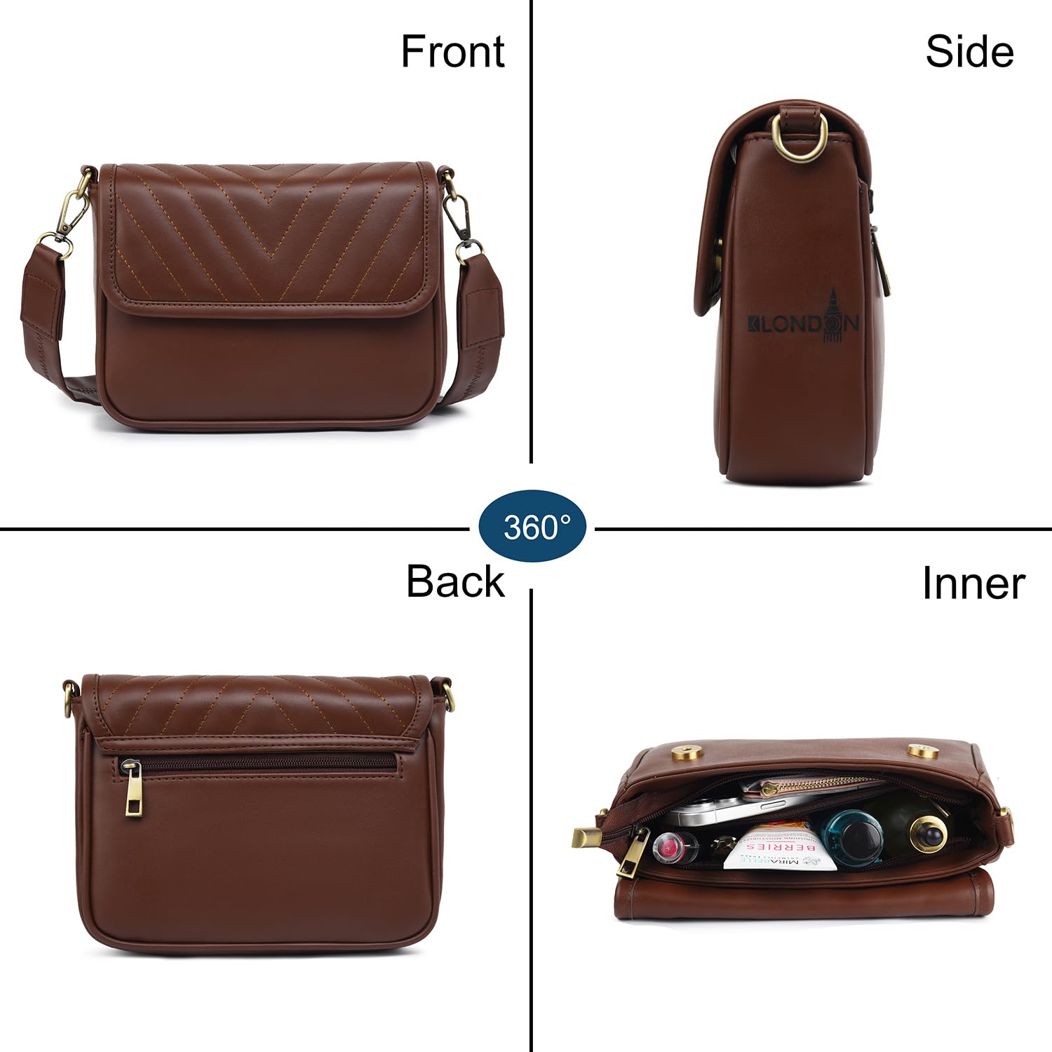 K London style with this sophisticated K London sling bag crafted from premium PU leather in this premium colour. The bag features an elegant quilted pattern on the flap, adding a touch of modern luxury. With dimensions of 21.5 cm length, 16 cm height, and 6.5 cm width, this versatile bag offers ample storage through its thoughtfully designed compartments. The main section includes two spacious compartments separated by a secure zippered pocket, while additional storage options include side slip pockets and an external back zipper compartment. The magnetic flap closure ensures easy access while keeping your belongings secure. The adjustable and detachable shoulder strap allows for comfortable wear across various occasions. Perfect for daily use, this crossbody bag combines practicality with style through its organised interior, which easily accommodates essentials like mobile phones, wallets, and cosmetics. The brass-toned hardware and distinctive K London branding add refined finishing touches to this contemporary accessory.