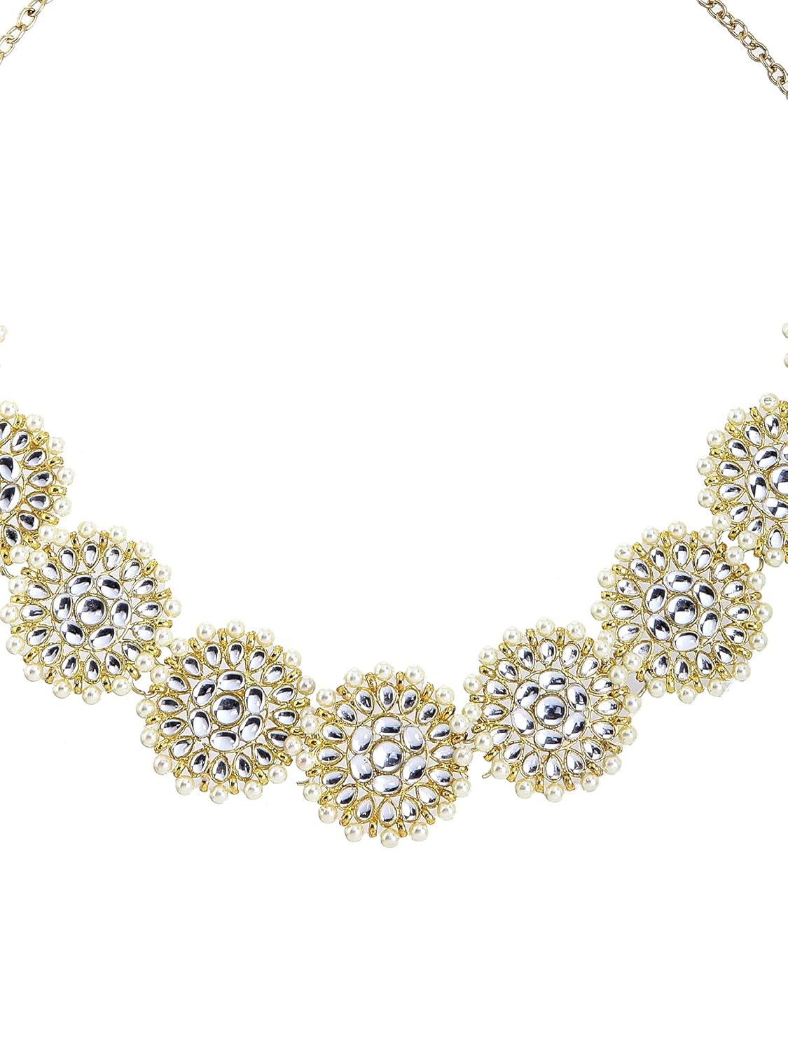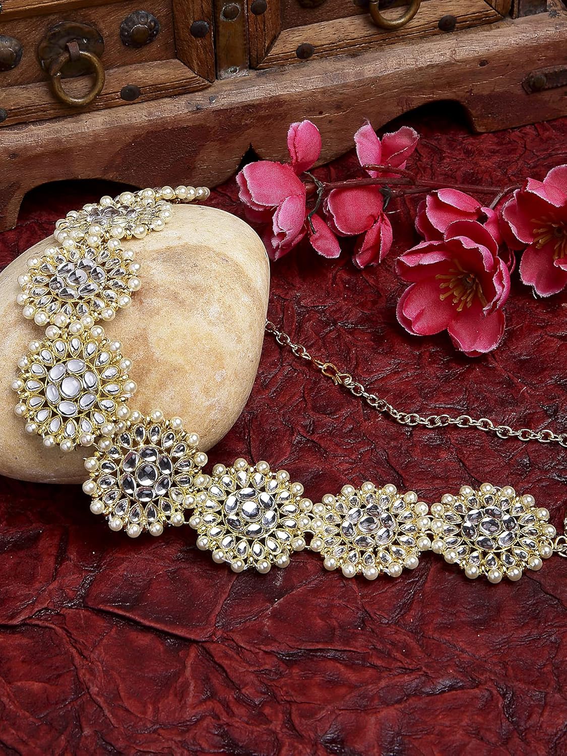 Karatcart Floral Shape Kundan Studded Hairband for Women. It’s Five Layer Micro Gold Plated and Embellished with Kundan for High Durability. Intricate high polish creates glamorous reflections and adds a luxurious look. Perfect for Weddings, Festivals, Traditional Occasions. Best when paired with any Indian outfit.
