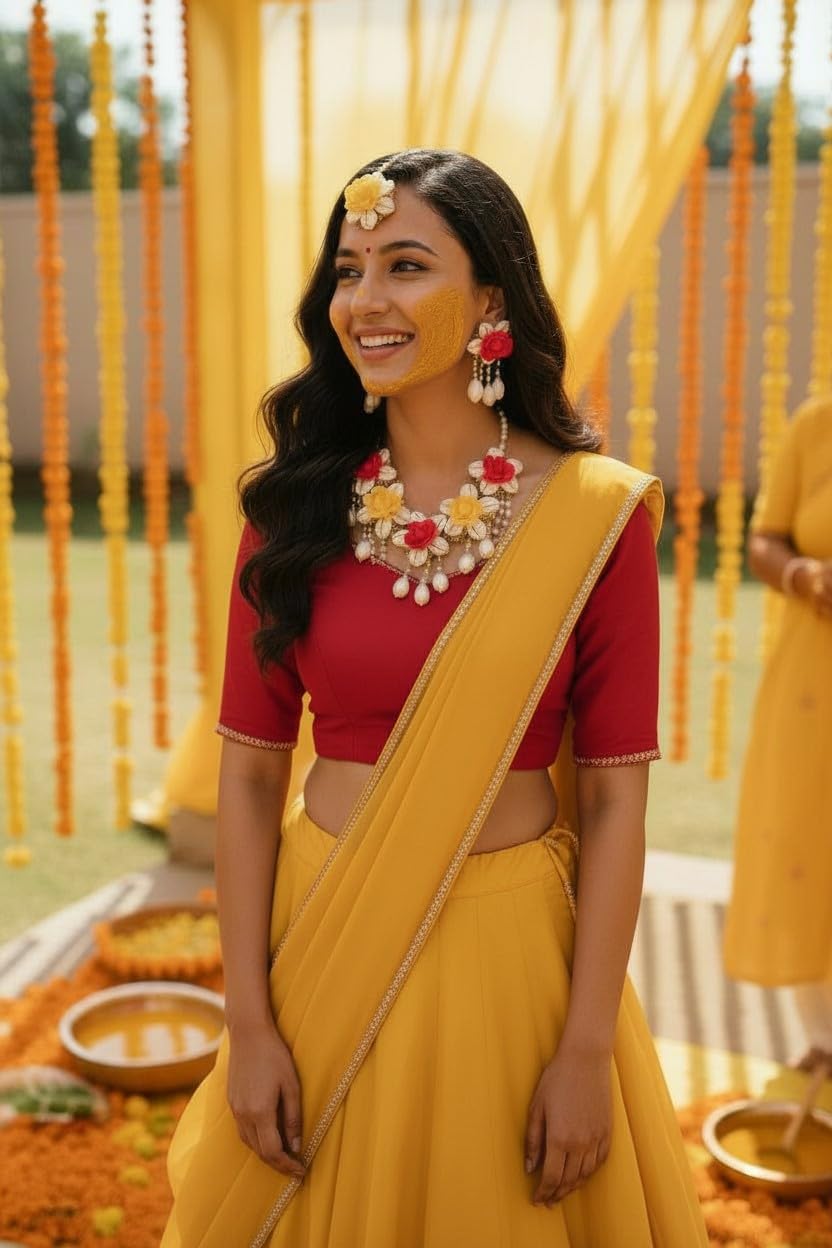 Adorn yourself with the captivating beauty of this Bridal Flowers Jewellery Set, perfect for mehndi jewelry, Haldi, Wedding, Bridal, or Baby Shower occasions. This exquisite Bridal jwellery set features a stunning Necklace, Maang Tika and a pair of matching earrings adorned with delicate floral motifs.This complete floral bridal jwellery is going to add touch of elegance and tradition to your ensemble. Meticulously crafted, this set is designed to complement the vibrant hues and intricate designs of Indian ethnic wear. Embrace the charm of this Flower Haldi Mehandi Jwellery set and elevate your look to new heights. Crafted with precision and attention to detail, this jewellery set is a must-have accessory for every woman who appreciates the beauty of Indian heritage and culture. Package contain : 1.Maang Tikka 2.A Neclace with Adjustable Dory 3.A pair of Earring Note : These are handmade products ,please dont compare with machine made products Note :Colour of the products may slight varies due to photography and lighting effects