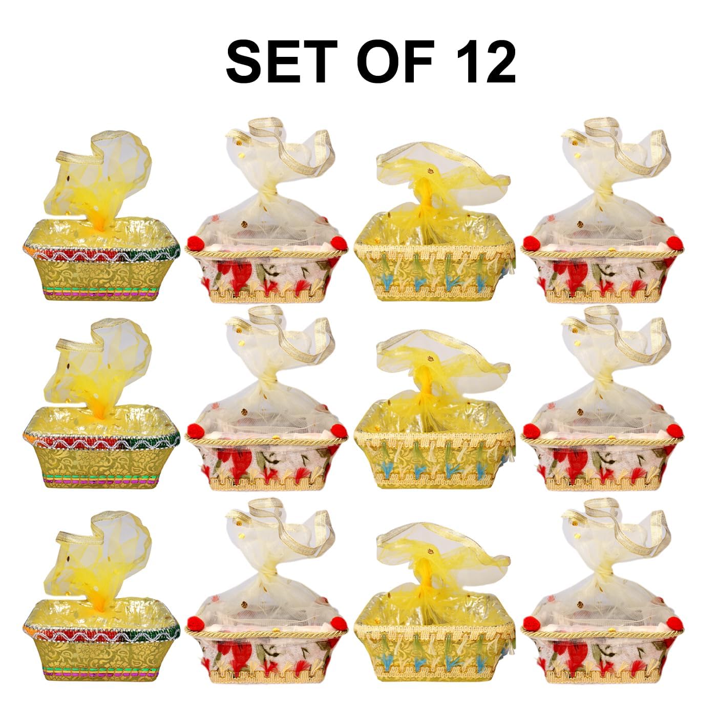 This gift packing basket base is constructed from high-quality materials, ensuring long-lasting durability and strength to withstand everyday use. Covered in soft satin fabric and adorned with decorative shiny lace. The addition of a top covering net enhances its attractiveness, making it the perfect complement to any gift. The embellishments, including sequence laces, golden gota, and fancy embossed lace, add a touch of luxury to its design. Its perfect size and trendy design make it an ideal choice for various events, adding a touch of rustic charm to weddings and other special occasions. Can be used in wedding hamper, baby shower gifting, room hampers, Bride shagun hamper, thanks giving hamper, etc.