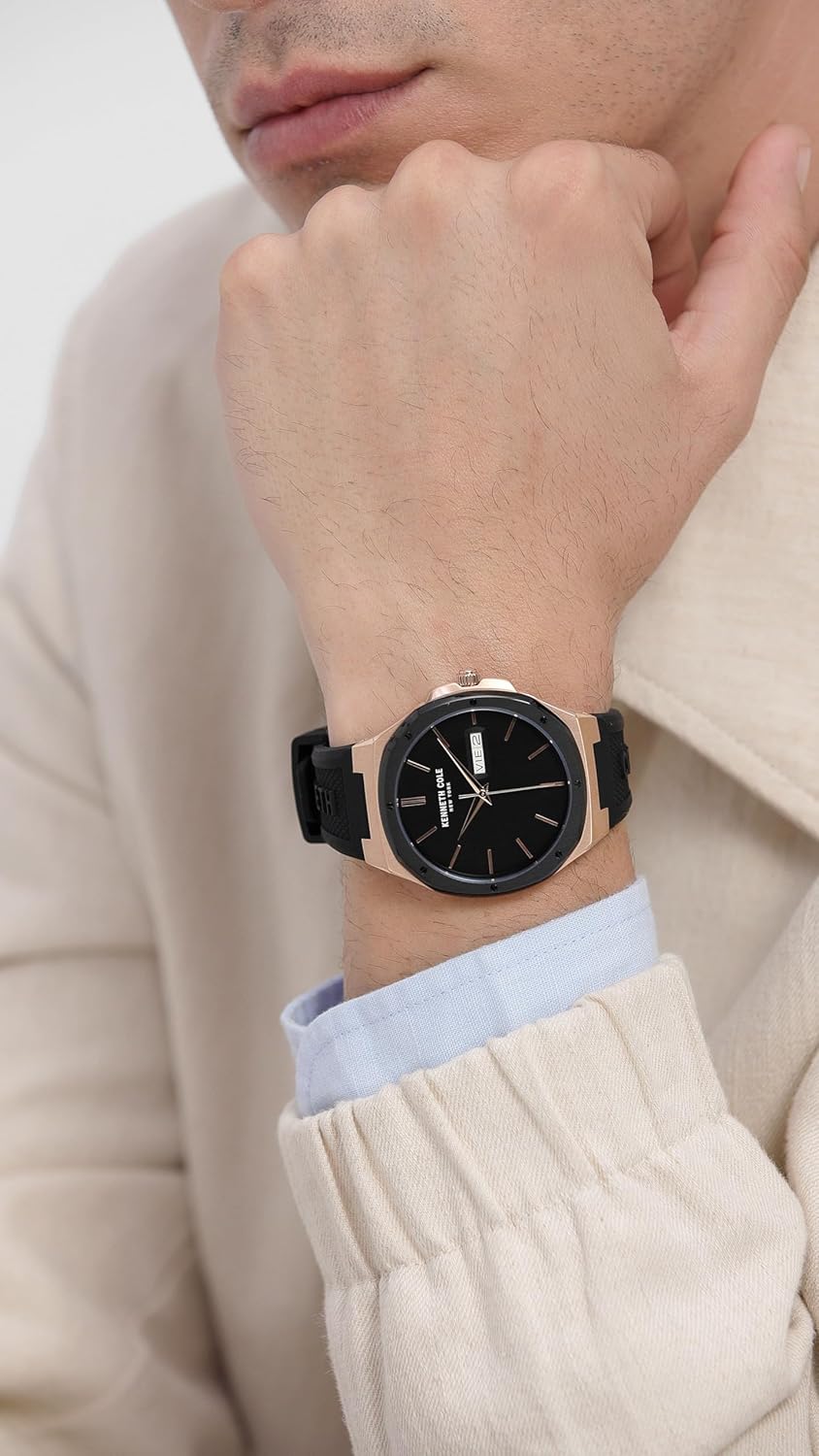 Sophisticated and versatile, this Kenneth Cole watch blends modern styling with everyday functionality. The brushed black dial is accented with sleek rose gold hands and markers, offering a refined contrast against the bold black bezel. A practical day and date display enhances utility, while the rose gold case paired with a textured black silicone strap delivers both durability and comfort. Designed for effortless transition from casual to formal looks, this timepiece brings a polished edge to contemporary wear.