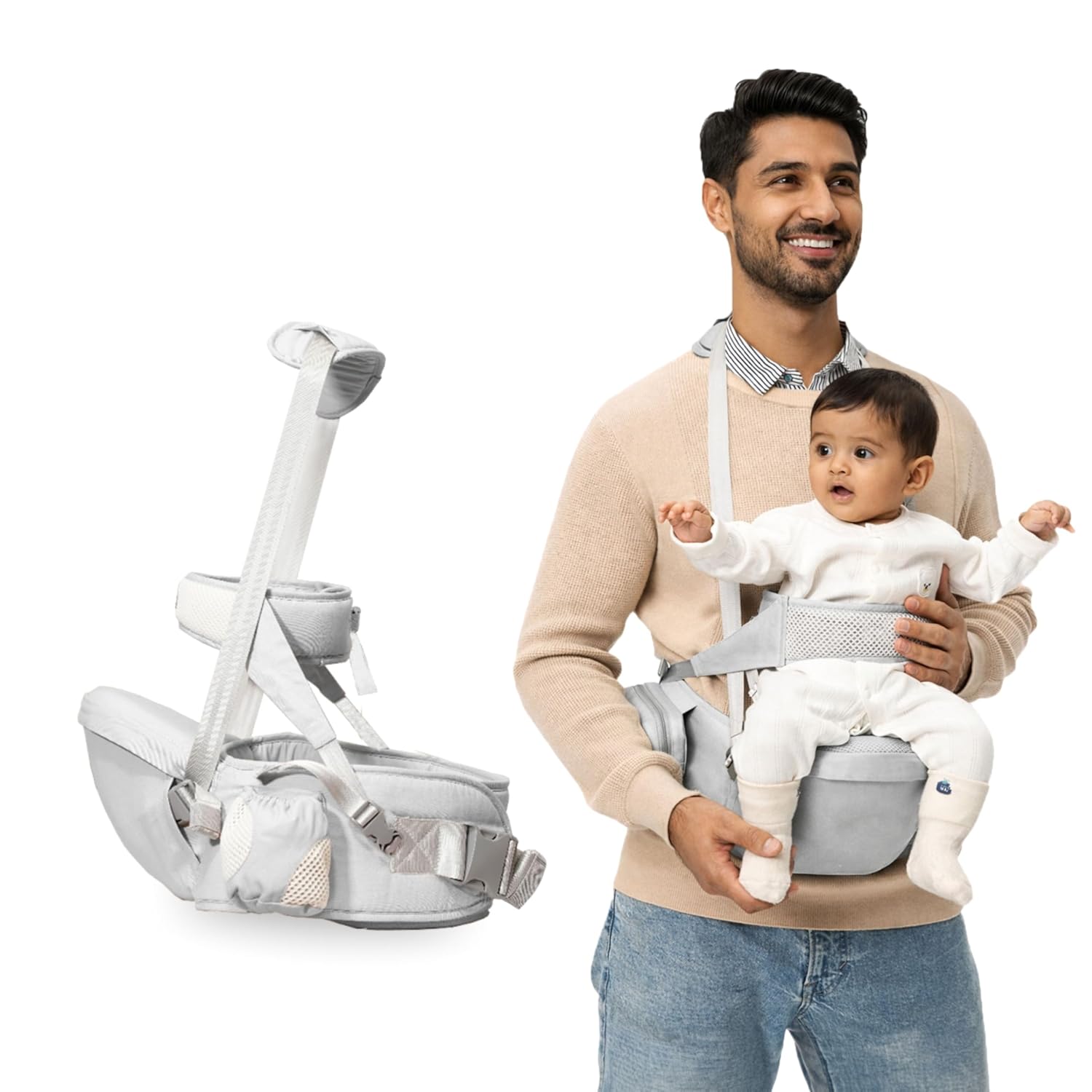 Kids Station Baby Carrier with 4 Carry Positions, Patented Design, Baby Carrier made up of Cotton, Designed for Indian Environment, Adjustable New-Born to Toddler Carrier, Max Weight Up to 15 Kgs (Grey, Happy Strap)