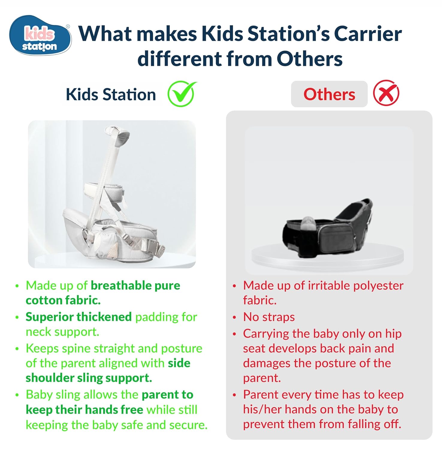 Easy to Use with Proper Support: Designed with both parents and babies in mind, the Kids Station baby carrier offers ease of use and proper support. It provides essential support for the baby’s head, neck, spine, and hips, promoting healthy development and preventing undue strain. With intuitive adjustments and ergonomic features, parents can quickly and securely position their baby in the carrier, giving them peace of mind and allowing for comfortable and extended wear.
