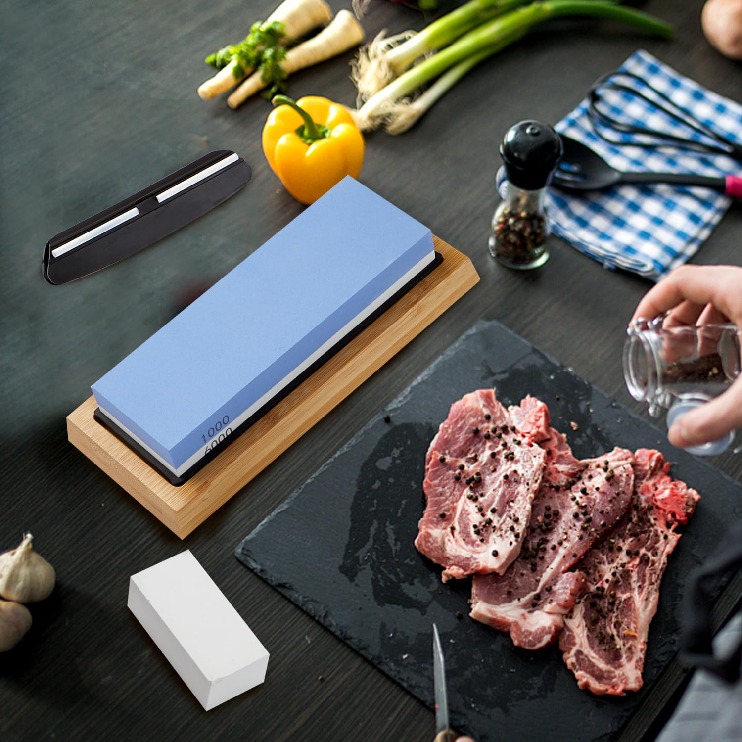 PRECISE ANGLE GUIDE: There is an angle guide for beginners included in the whetstone set, keeping the blade at a 20-degree angle during sharpening