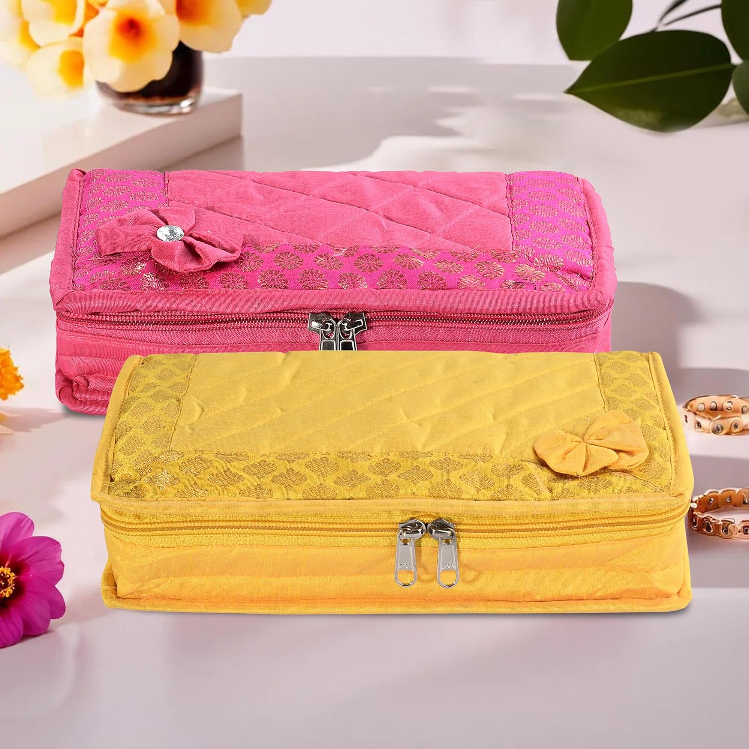 ✅ Package Contains – (Pack of 2) Jewellery Kit/Pouch | Color – Yellow & Pink | Material – Polyester | Product Dimensions – 25 cm x 15 cm x 7 cm