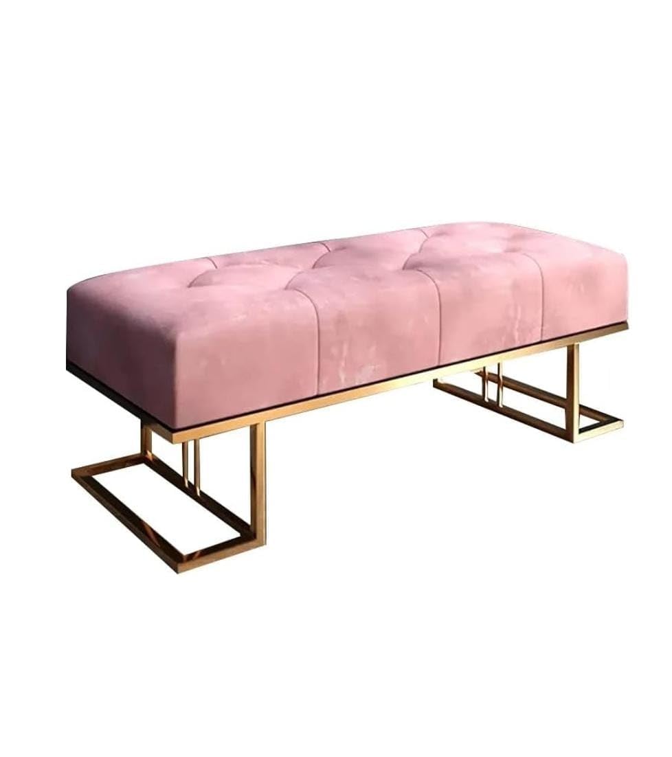 Elevate your living space with this stunning KUZZLE ottoman bench that perfectly marries luxury and functionality. The plush pink velvet upholstery features elegant tufted detailing, creating a sophisticated quilted pattern that adds visual interest and texture. The robust gold metal base showcases a modern geometric design, providing both stability and contemporary style. This versatile piece works beautifully as additional seating, a footrest, or a statement accent in your living room, bedroom, or entryway. The sleek silhouette and premium materials make it an ideal choice for modern and glamorous interior settings. The combination of soft velvet and metallic elements creates an eye-catching contrast that instantly draws attention. Whether placed against a bold wall colour or in a neutral space, this ottoman bench serves as a stunning focal point while offering practical functionality for your home.