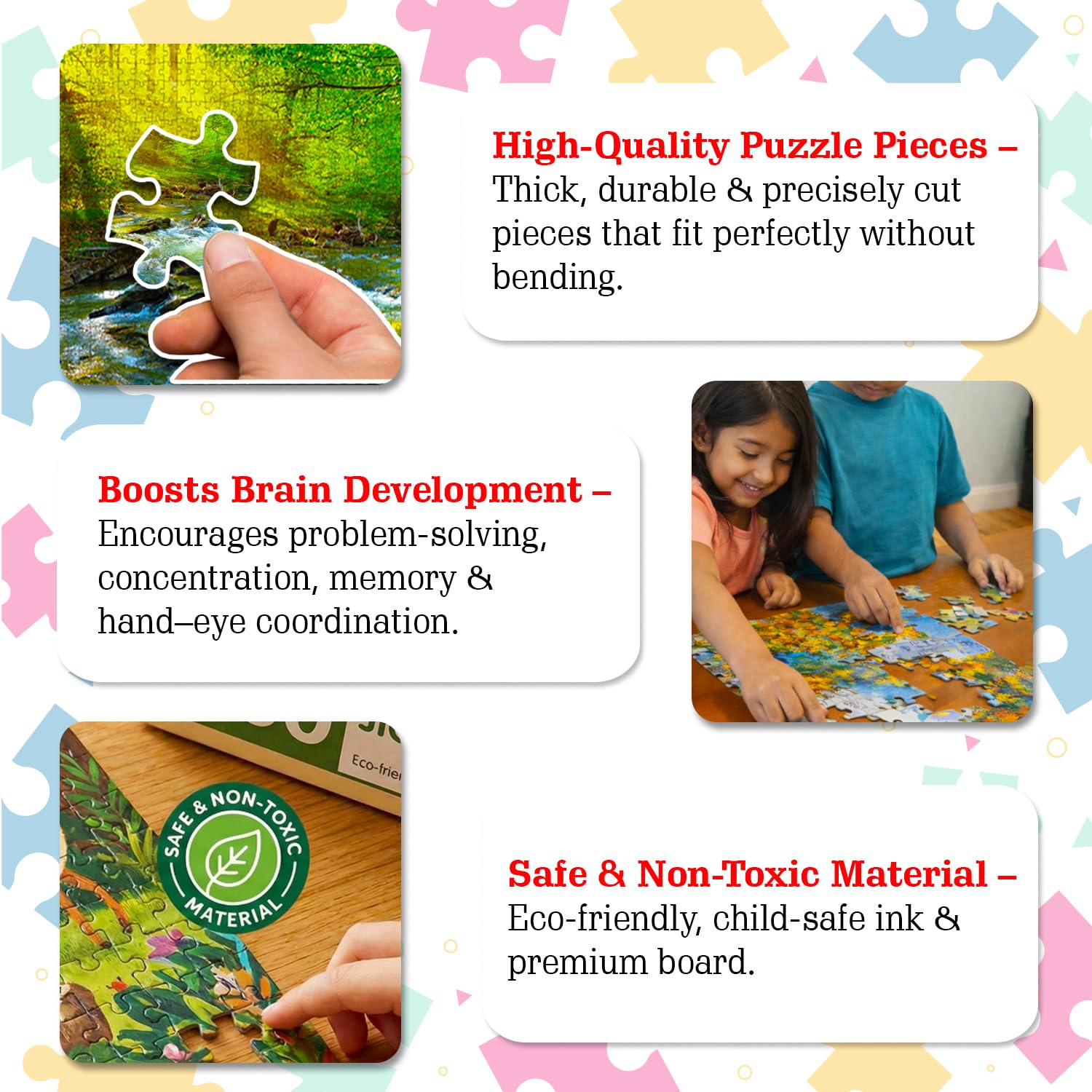 High-Quality and Durable Pieces: Each puzzle piece is made from premium materials with a smooth, sturdy finish, ensuring they fit perfectly and can withstand repeated use without damage.