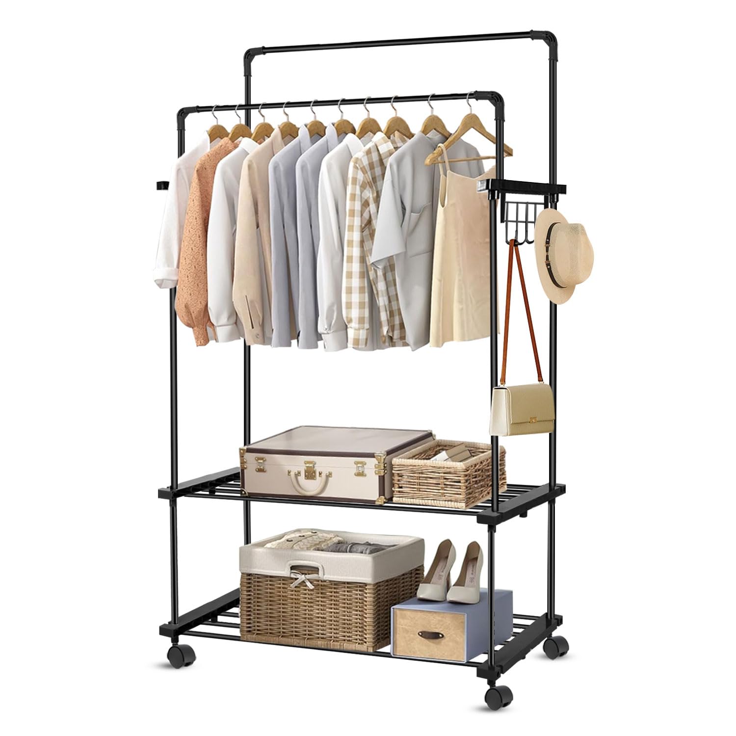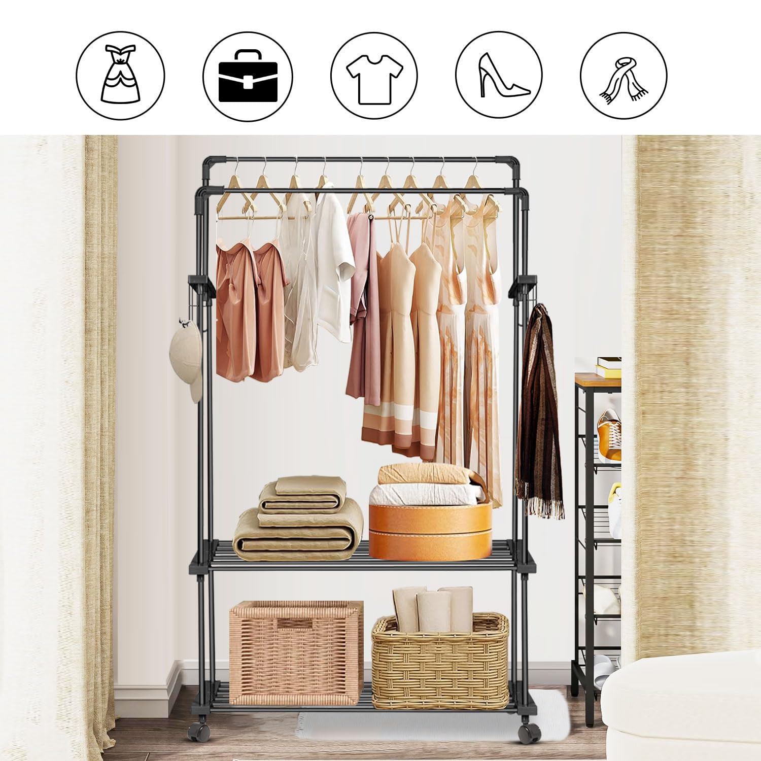 [STURDY AND DURABLE]: Clothing racks on wheels made of premium metal tubes, ensure excellent strength and stability, are absolutely sturdy, and can easily support a load of clothing on hangers along with stacks of blankets or towels. Multiple spraying processes are more waterproof and wear-resistant.