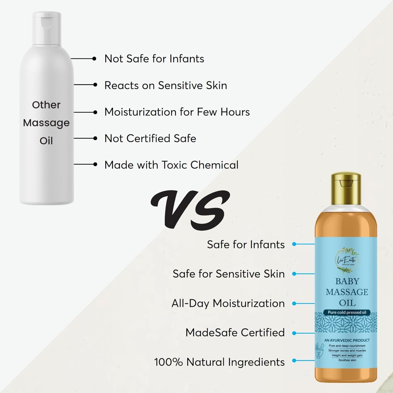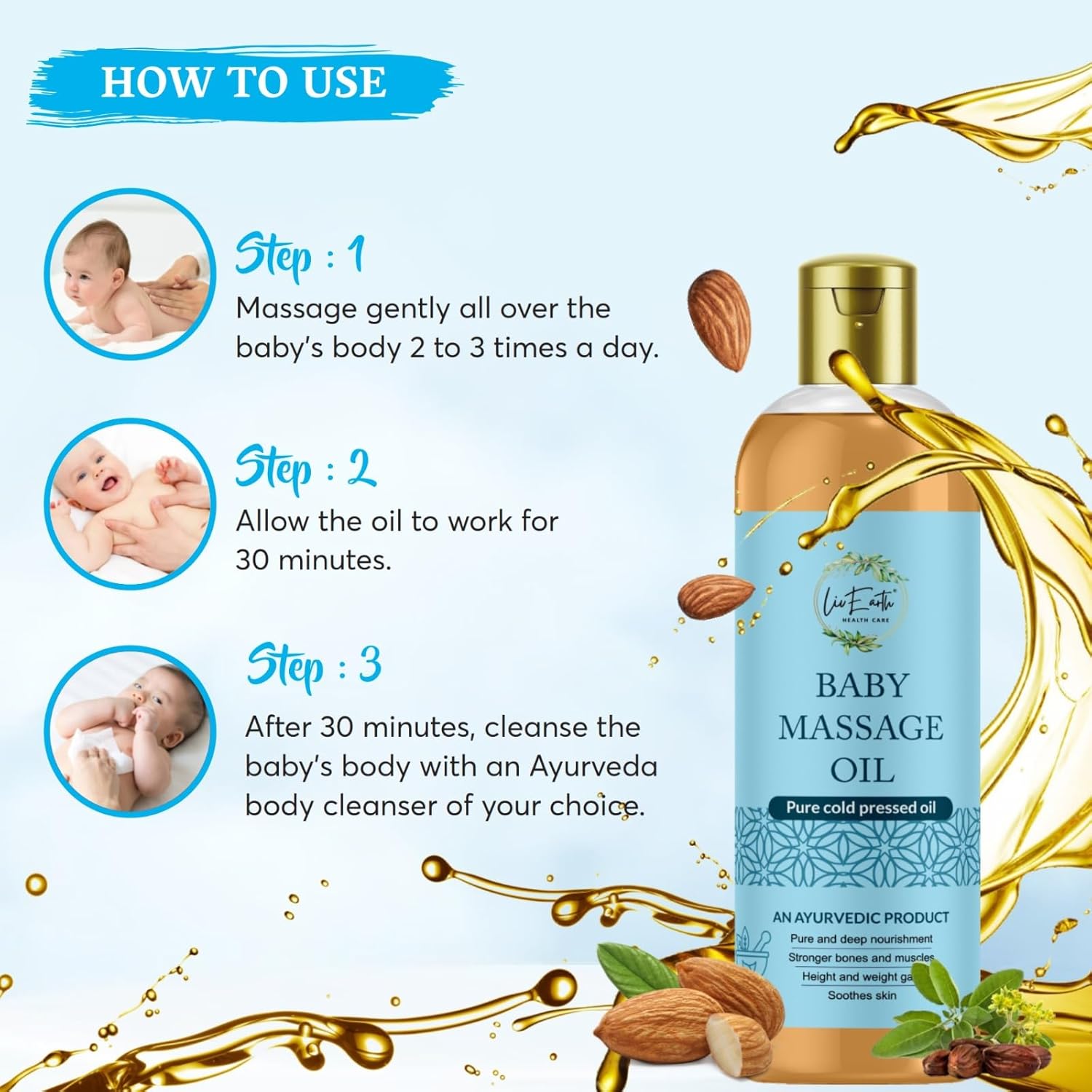 LiveEarth Baby Massage Oil is a carefully crafted Ayurvedic formulation designed to nourish, protect, and support your baby’s healthy growth journey. Enriched with natural ingredients renowned for their bone-strengthening and muscle-nourishing properties, it helps in the healthy development of the skeletal system while promoting steady height and weight gain during the crucial early years. Its gentle, non-irritating formula is perfectly suited for delicate baby skin, providing deep moisturization, soothing dryness, and leaving the skin soft, supple, and well-nurtured after every massage. Made using a pure cold-pressed process, the oil retains all essential nutrients, ensuring maximum purity and potency in every drop. Drawing from the time-tested wisdom of Ayurveda, it blends traditional herbal extracts that holistically support your baby’s overall well-being. More than just skincare, LiveEarth Baby Massage Oil encourages a soothing massage ritual that strengthens the emotional bond between parent and child, bringing comfort, relaxation, and love into your daily routine.