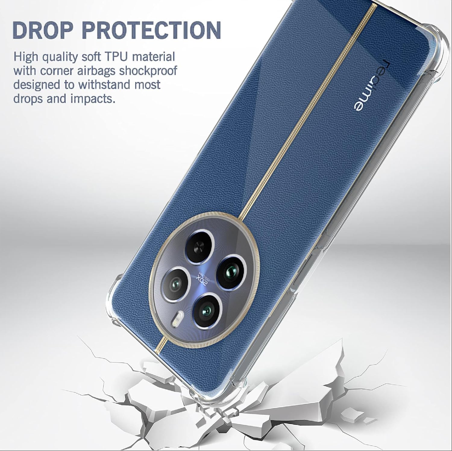 Full Protection with Shock Absorption — Realme 12 Pro / Realme P1 Pro 5G Soft TPU frame with four reinforced corners provides drop cushion to protect your phone. The edges of the case are raised, slightly protruding from their surfaces to protect the screen and camera from scratches and scuffs.