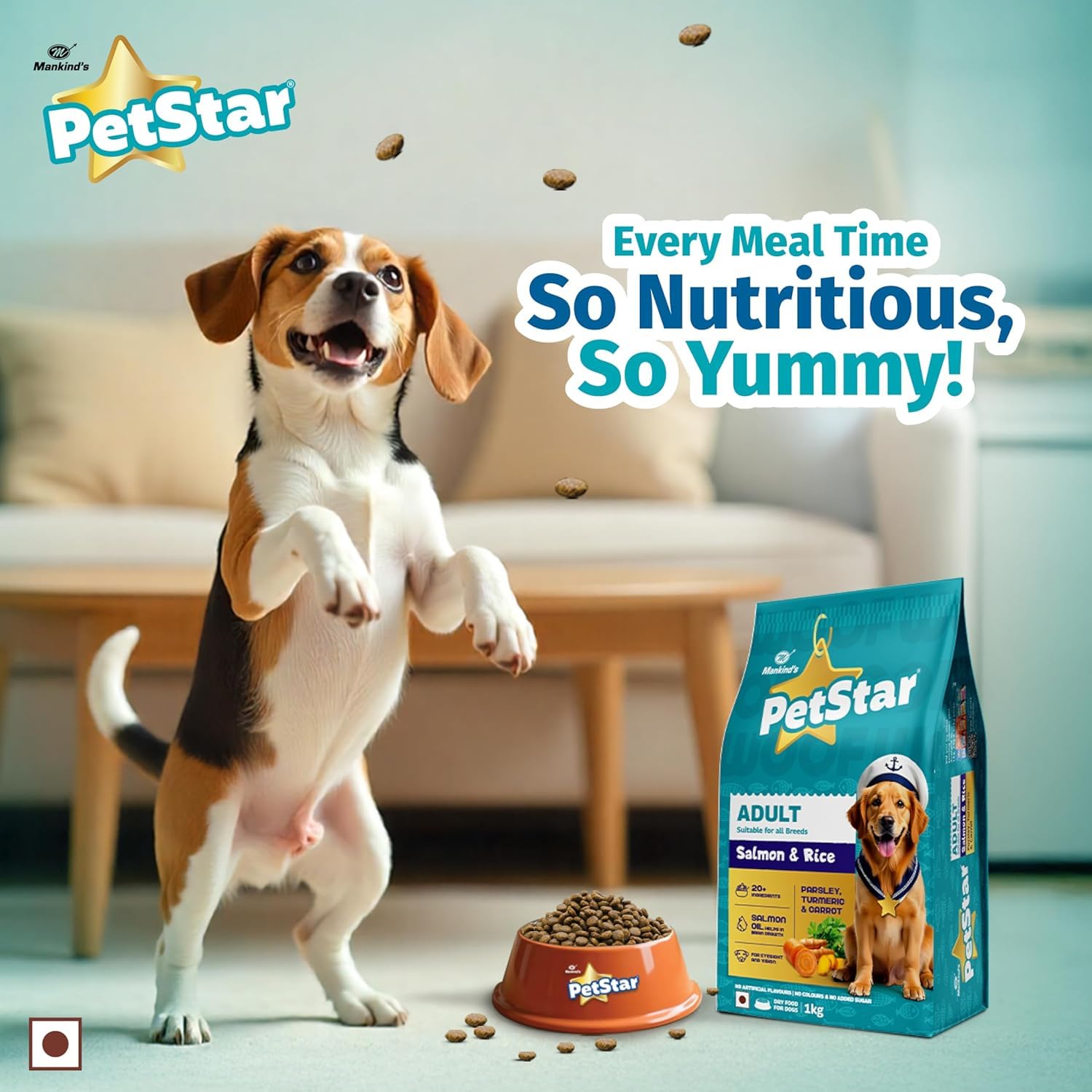 “PetStar Salmon & Rice, a wholesome recipe crafted with real salmon with 85% digestible salmon protein- to ensure maximum nutrient absorption for strong muscles and overall vitality. Breath Freshening & Digestive Support: The natural power of Parsley helps reduce bad breath and promotes a healthy digestive system Supports Flexible & Healthy Joints: The natural power of Turmeric helps reduce stiffness and swelling, so your dog can stay flexible and enjoy moving around Promote Sharp Vision & Enhance Trainability: Rich in Beta-Carotene from real Carrots, this food contributes to healthy eyesight and improved cognitive function, making training sessions more rewarding. Healthy Coat, Heart, & Brain from 3 Special unsaturated Oils: Rapeseed, linseed, and Salmon oils work together for a shiny coat, strong heart, and smart brain. Crafted in the UK for Indian Conditions: Made with 100% natural ingredients and absolutely NO artificial colors, flavors, or preservatives. Our UK-made recipe is expertly tailored for the unique climate of India. Crafted in the UK for Indian Conditions: Made with 100% natural ingredients and absolutely NO artificial colors, flavors, or preservatives. Our UK-made recipe is expertly tailored for the unique climate of India. No Added Sugar: A naturally delicious recipe without any unnecessary added sugars. No Artificial Nasties: Made with NO artificial colors or preservatives. Ashwagandha renders healthy aging, Improves muscle Strength, provides calming effect and shinier skin coat. Silybum Marianum for protecting liver and renal health. Rigorous Testing: Each kibble undergoes thorough microbiological and chemical tests, adhering to global standards for safety and quality assurance. Mankind’s PetStar pet food is tested across geography and breeds specifically those living in India’s climatic conditions. It is known for being one of the most palatable and well-liked foods by dogs of all breed and age.”