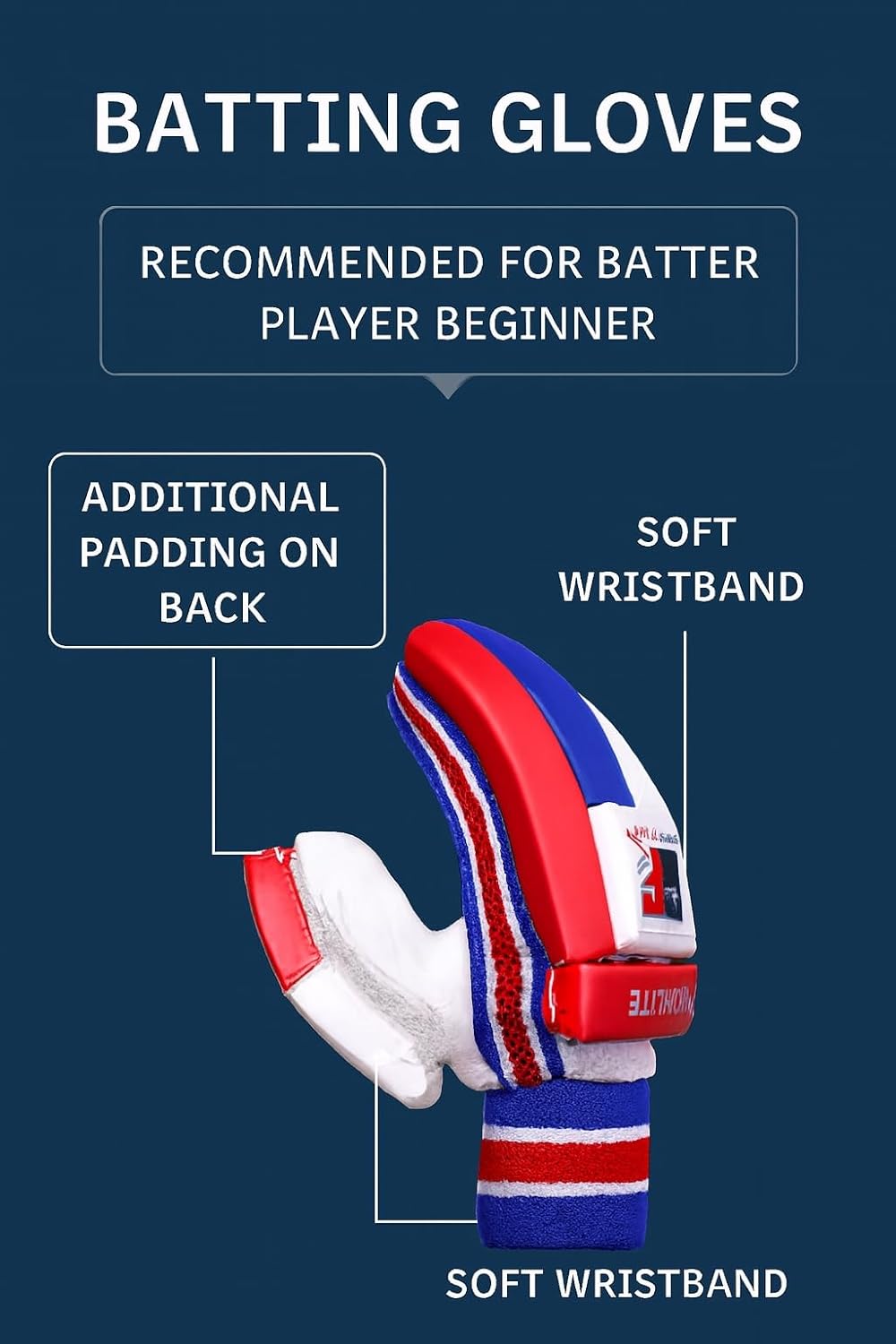 PREMIUM DESIGN: Professional Cricket batting gloves featuring red, white, and blue colour scheme with mesh ventilation and secure wrist strap for optimal fit