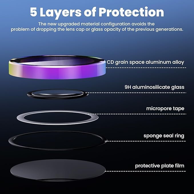 【Full lens protection 】This camera lens screen protector is cut completely to the right dimensions. It’s a round lens protector with aluminum frame. Full Coverage seamless fit to lenes plus inner high-stick adhesive layer, isolated from water, dust and fog.