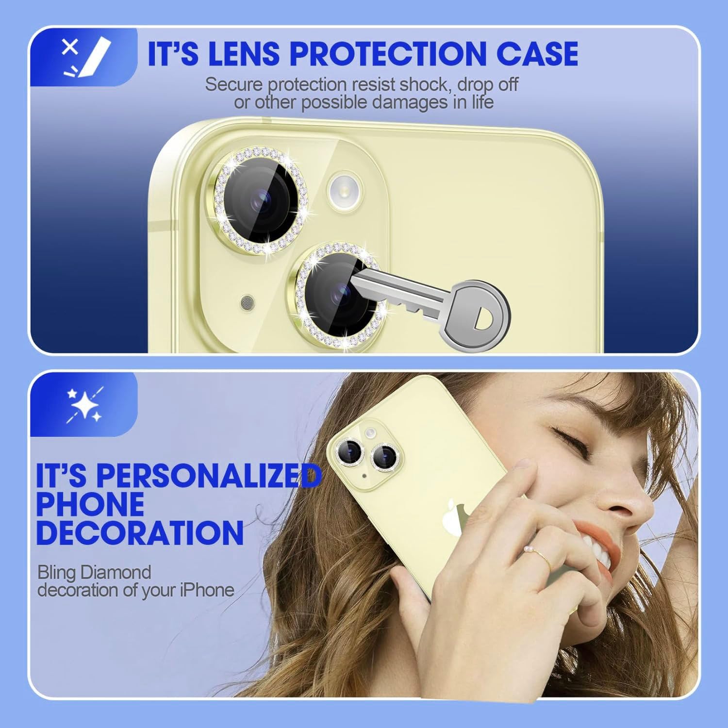 MAYBAL® Diamond Camera Lens Protector Compatible for iPhone 15/15 Plus- Alloy Metal Cover with Tempered Glass Screen Protector – Scratch Resistant, Easy Installation – Diamond Yellow