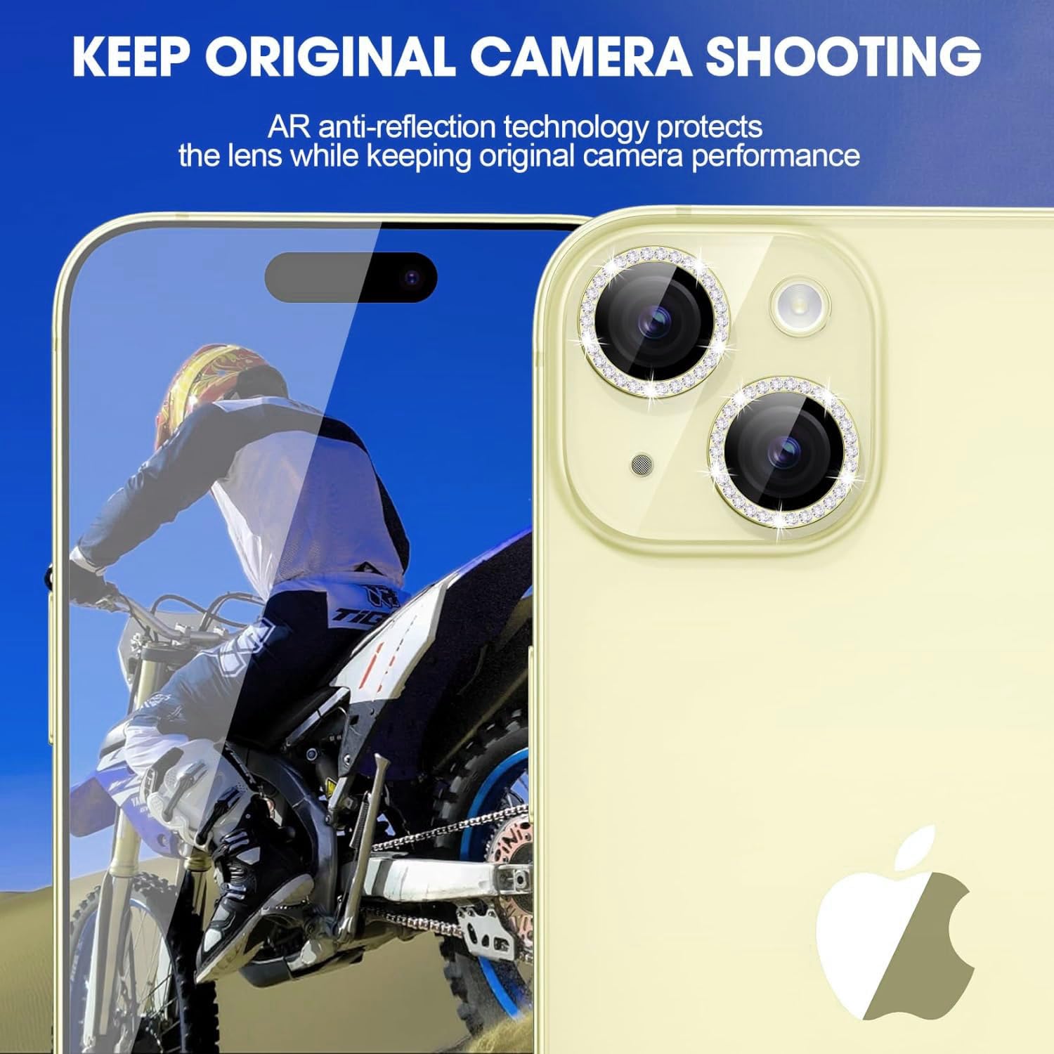 MAYBAL® Diamond Camera Lens Protector Compatible for iPhone 15/15 Plus- Alloy Metal Cover with Tempered Glass Screen Protector – Scratch Resistant, Easy Installation – Diamond Yellow