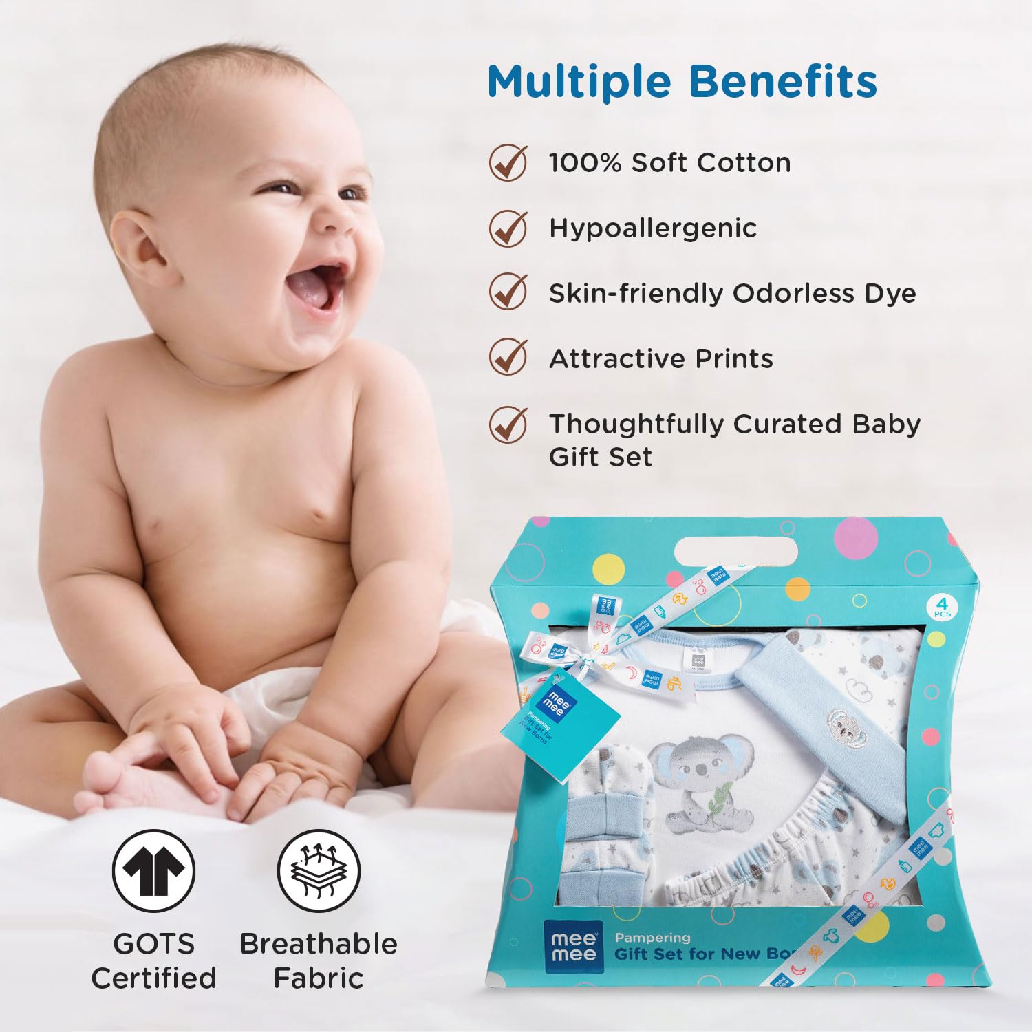 Perfect Gift Set: Welcome your newborn with the Mee Mee Gift Set, featuring 4 essential pieces, 1 baby tshirt jabla, 1 baby pant, 1 soft full cover round baby cap, 1 set of easy-to-wear booties.