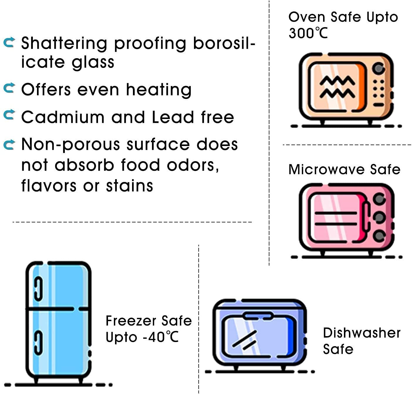 Material : Borosilicate || Resist Temperature : +300 C to -5 C || Microwave Safe , Oven Safe, Dishwasher Safe, Freezer Safe