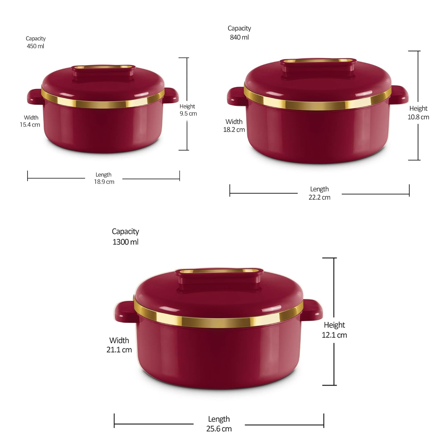 Colour: Maroon; Material: Inner Stainless Steel; Package Contents: 3 – Piece Curve Casserole Set (450 ml, 830 ml, 1300 ml); Product Dimension in cms (L x W x H): 450 ml (18.9 x 15.4 x 9.5), 840 ml (22.2 x 18.2 x 10.5), 1300 ml (25.6 x 21.1 x 12.1)