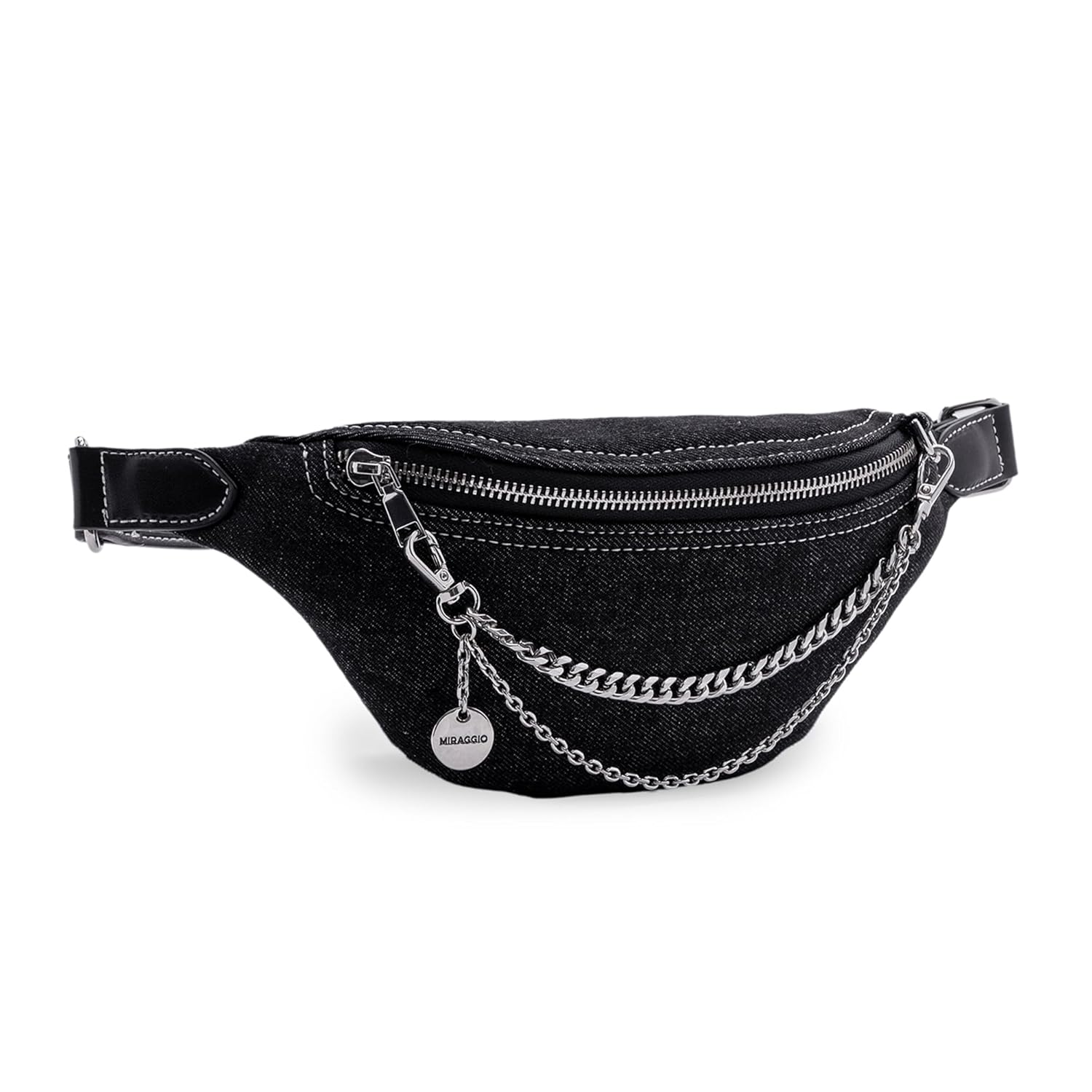 PREMIUM MATERIAL: Made from bold washed indigo denim in a rich dark blue hue, this women’s fanny pack features standout contrast color stitching and is elevated with the signature Miraggio metal charm for a polished street-style vibe.