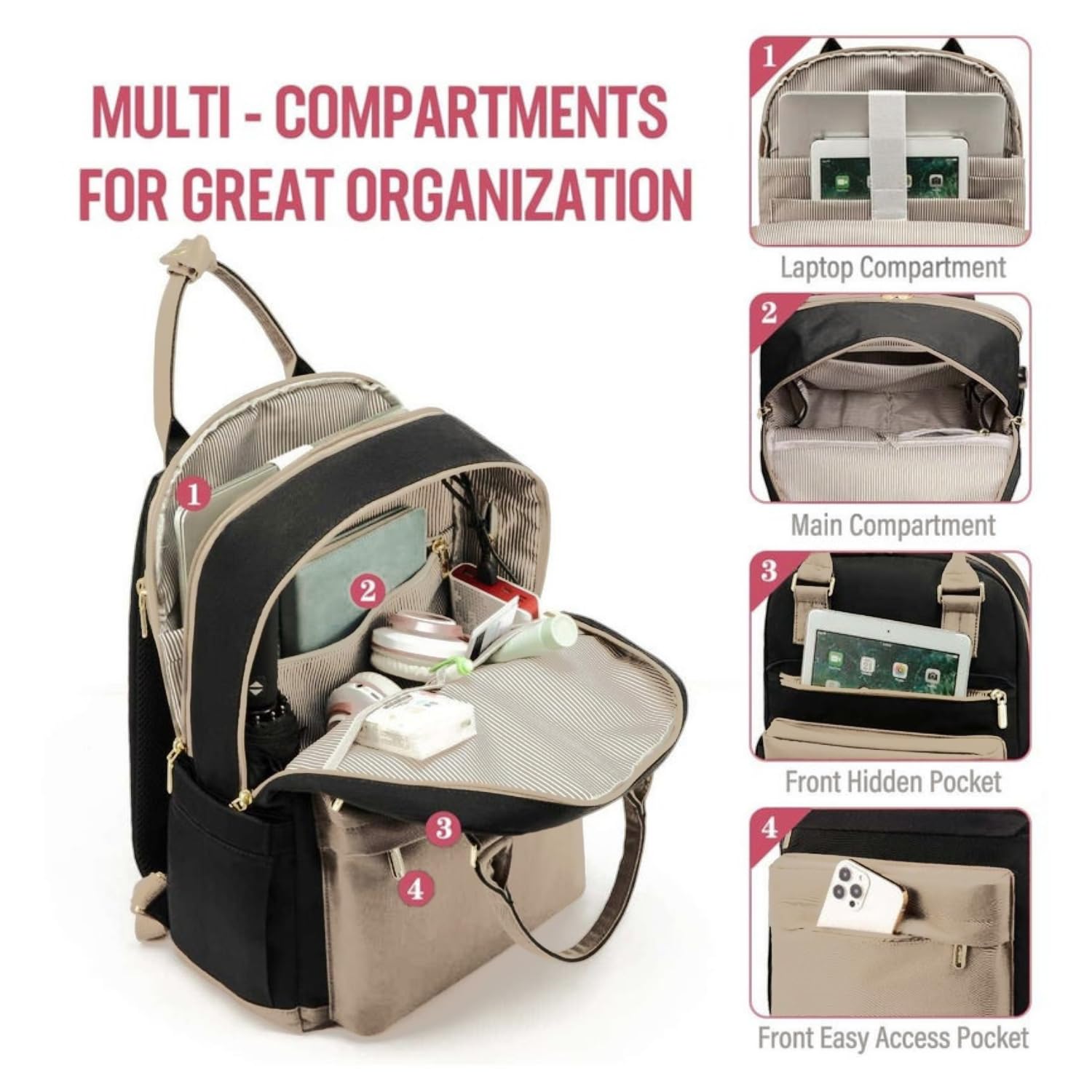 Elevate your daily commute with this sophisticated laptop backpack that seamlessly blends style and functionality. Crafted from premium PU leather in an elegant beige and black colour combination, this backpack features a modern design with gold-tone hardware accents. The spacious main compartment accommodates laptops while multiple pockets keep your essentials organised. A standout feature is the built-in USB charging port, allowing you to conveniently charge your devices on the go. The water-resistant exterior protects your belongings, while the padded shoulder straps ensure comfortable carrying. Perfect for professionals, college students, or travellers, this versatile backpack offers both practicality and refined aesthetics. The durable construction and thoughtful details like the top handles provide additional carrying options. Whether heading to the office, campus, or embarking on a weekend getaway, this backpack delivers the perfect blend of style, comfort, and utility.