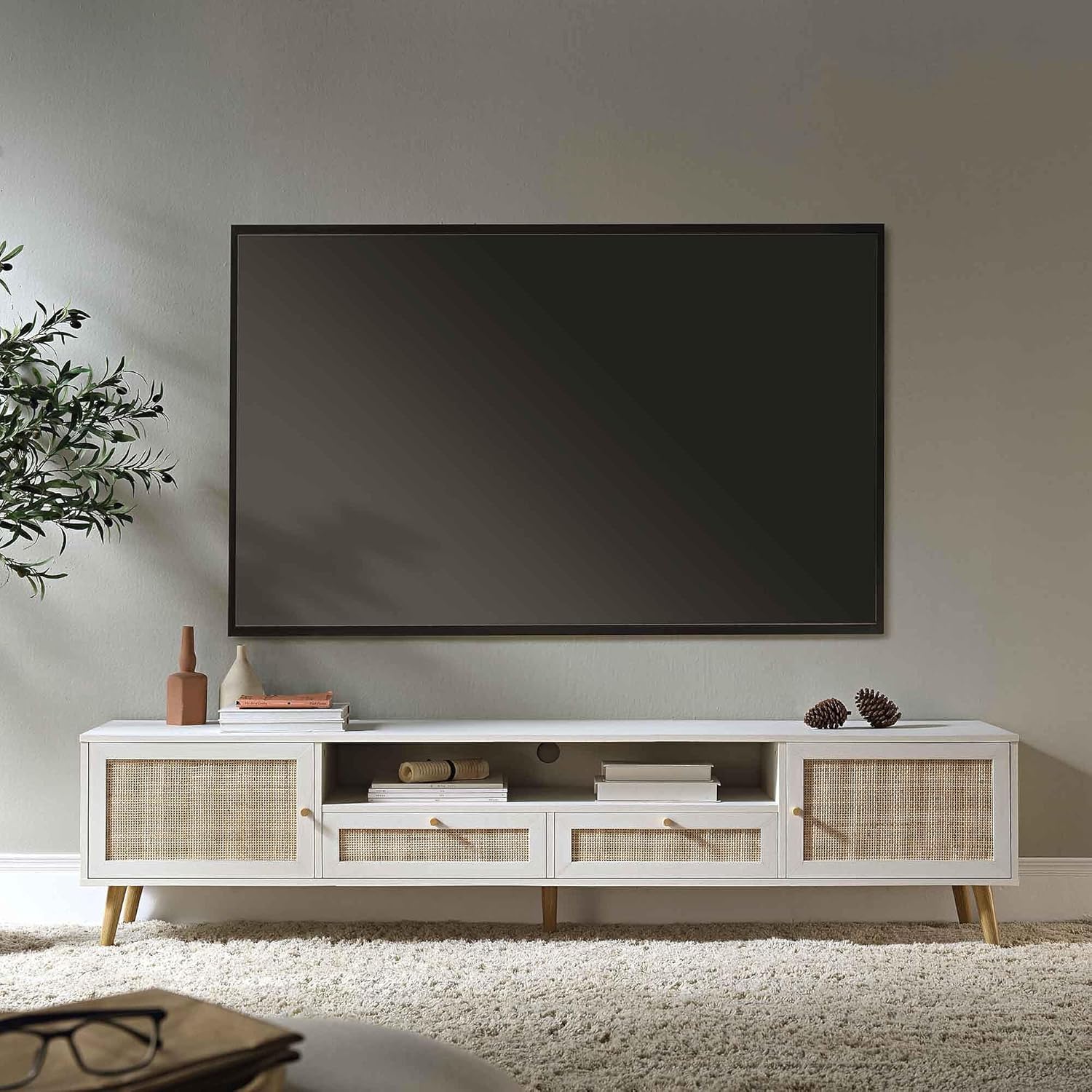 Elevate your entertainment space with this sophisticated modern TV stand that seamlessly blends style and functionality. The elegant white finish complemented by natural rattan door panels creates a perfect balance of contemporary and coastal aesthetics. This spacious media console features four thoughtfully designed storage compartments – two side cabinets with rattan doors for concealed storage, two central drawers with charming rattan fronts, and an open middle shelf perfect for media devices. The sleek wooden legs add a mid-century modern touch while providing sturdy support. The generous size accommodates large televisions while offering ample storage space for media equipment, gaming consoles, and entertainment essentials. The clean lines and minimalist design make it a versatile piece that complements various interior styles, from modern to coastal chic. The combination of white finish and natural rattan creates an airy, sophisticated look that brightens your living space while maintaining practical storage solutions.