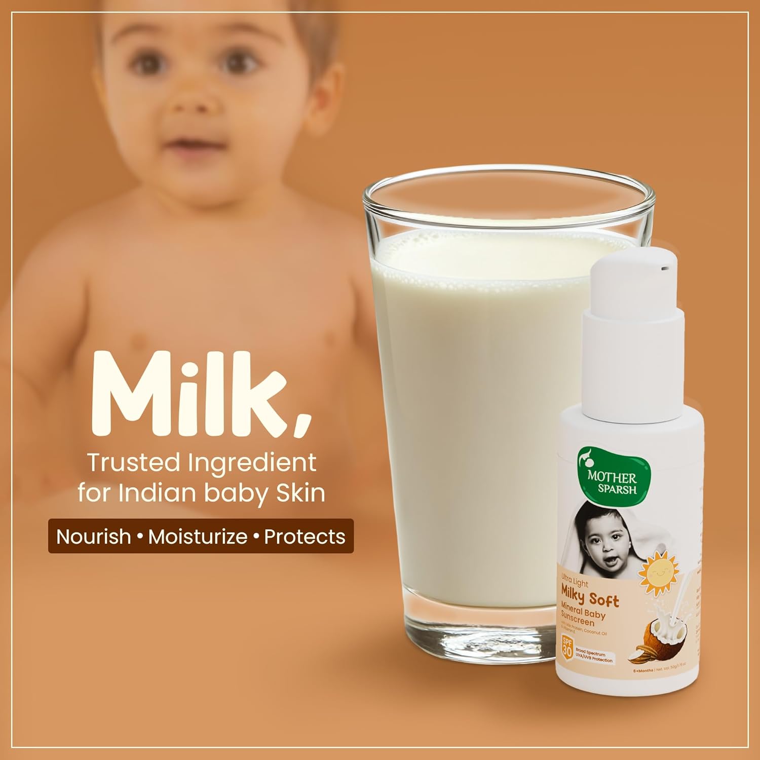 Ultra-Light SPF 30 Mineral Baby Sunscreen: Made with the goodness of milk and coconut oil to protect delicate baby skin against harmful UVA and UVB rays.